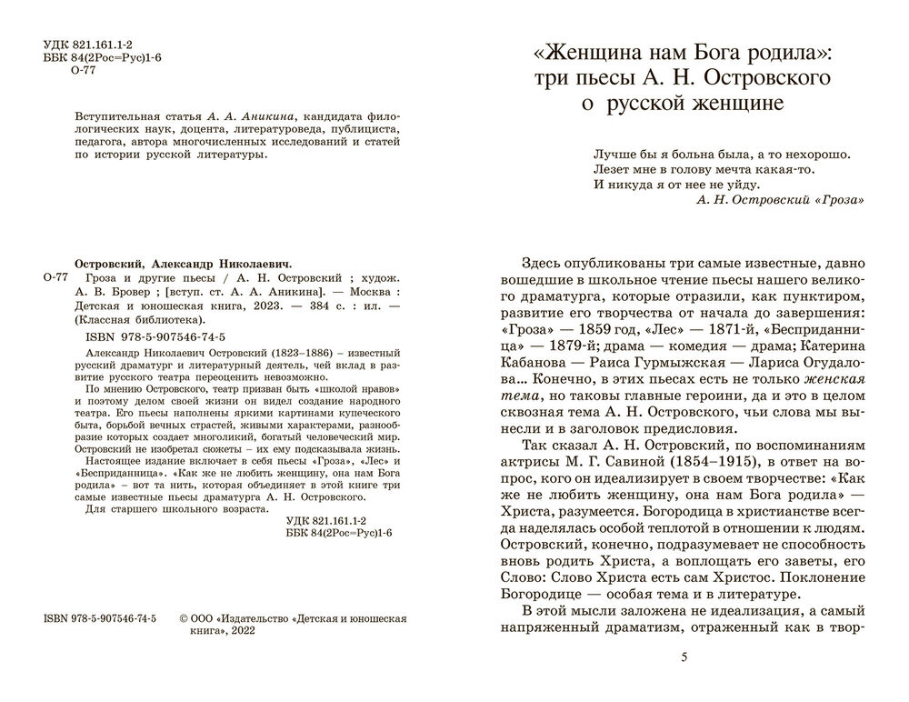 Настоящее издание включает в себя пьесы "Гроза", "Лес" и "Бесприданница". "Как же не любить женщину, она нам Бога родила" – вот та нить, которая объединяет в этой книге три самые известные пьесы драматурга.