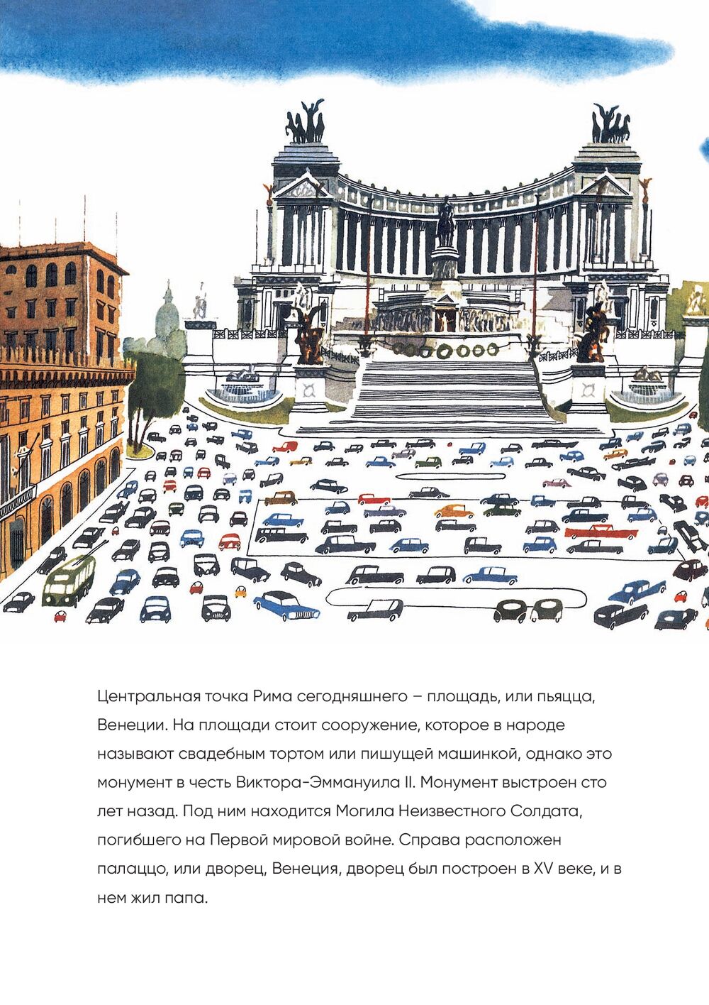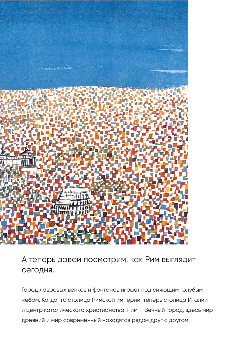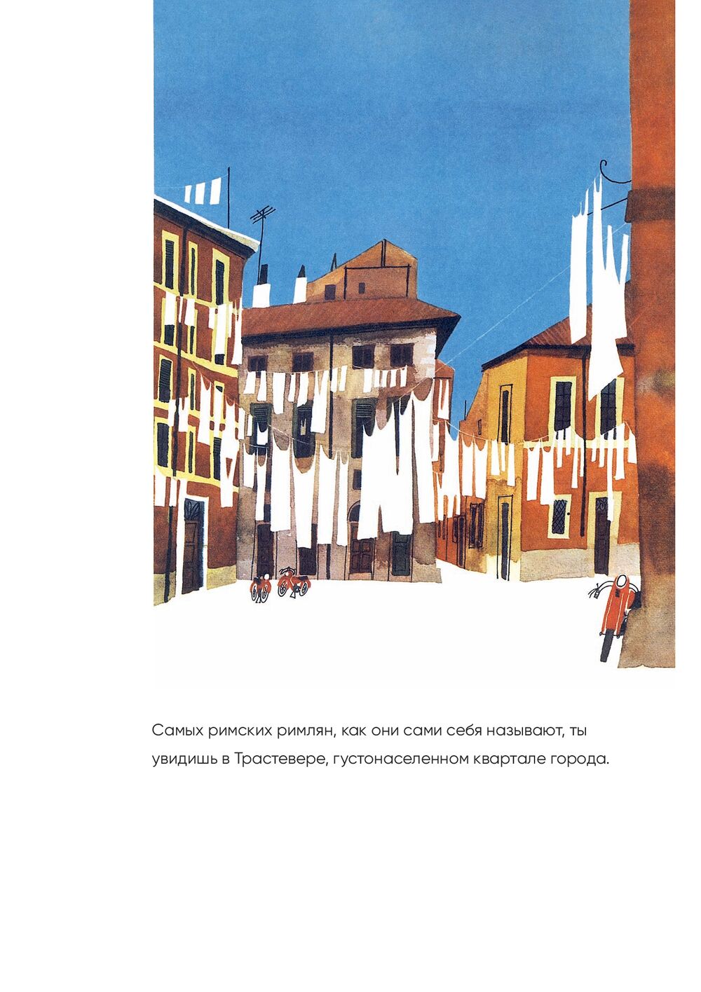 Мирослав Шашек ведет нас в незабываемое путешествие по Риму. Его иллюстрации – неожиданные, забавные и яркие покажут нам Рим древний и Рим современный – фонтаны, плещущие под ярким голубым небом, Римский Форум, Испанская лестница, древняя Аппиева дорога, самый знаменитый собор в мире – Базилика Святого Петра. Мы увидим апельсины и лимоны, созревающие в городских двориках, пальмы, растущие на крышах домов. Увидим статуи и мотоциклы. И жизнерадостных римлян, которые живут в "вечном городе".