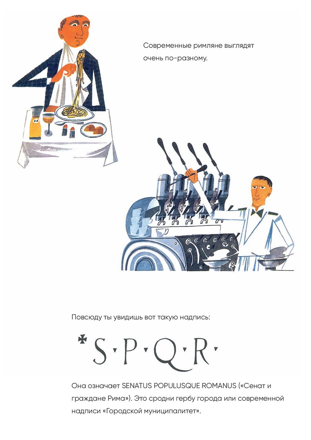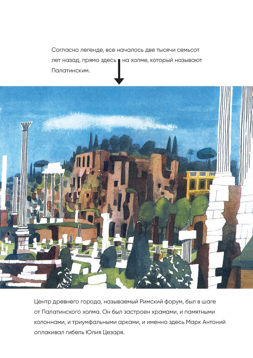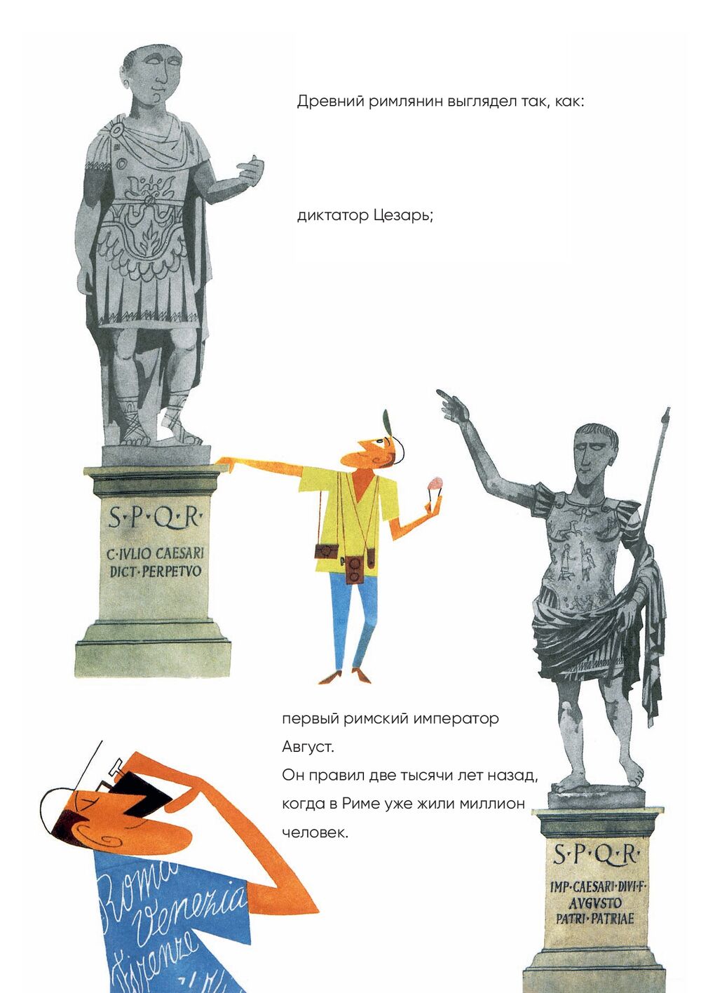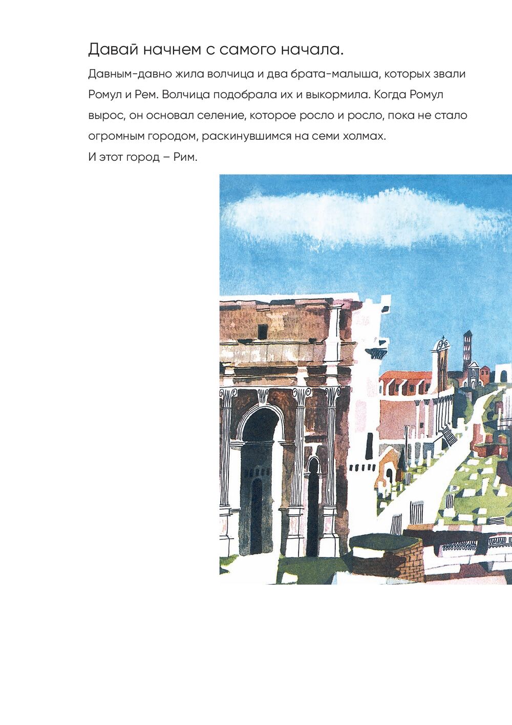 Мирослав Шашек ведет нас в незабываемое путешествие по Риму. Его иллюстрации – неожиданные, забавные и яркие покажут нам Рим древний и Рим современный – фонтаны, плещущие под ярким голубым небом, Римский Форум, Испанская лестница, древняя Аппиева дорога, самый знаменитый собор в мире – Базилика Святого Петра. Мы увидим апельсины и лимоны, созревающие в городских двориках, пальмы, растущие на крышах домов. Увидим статуи и мотоциклы. И жизнерадостных римлян, которые живут в "вечном городе".