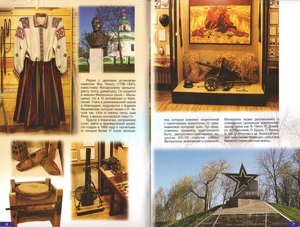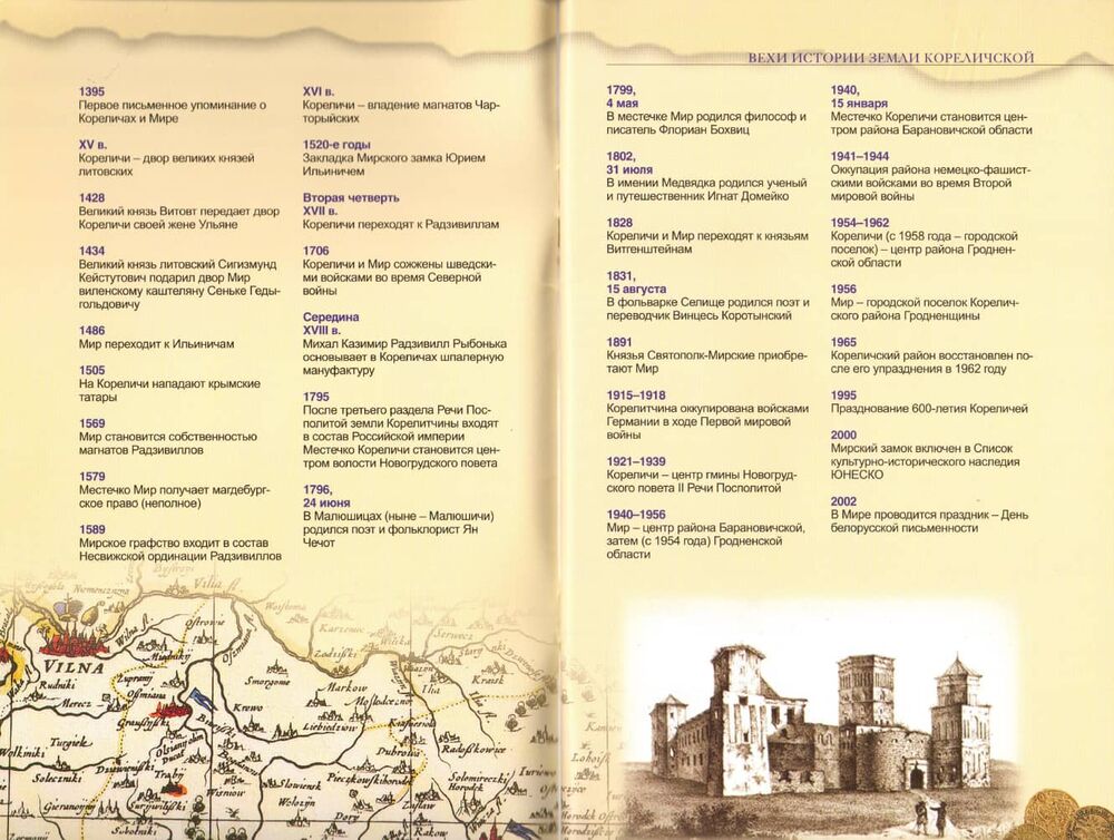 На этой земле присходило множество исторических событий, родилась целая плеяда замечательных людей, построено огромное количество архитектурных, гражданских и сакральных сооружений, некоторыми из них мы имеем возможность любоваться и сегодня. Отблески былого великолепия и могущества можно найти в Бережно, Березовце, Большой Медвядке, Больших Жуховичах, Великой Слободе и, конечно, в Мире. В путеводителе перечислены основные туристические маршруты Кореличской земли, представлена информация о местной инфраструктуре туризма.