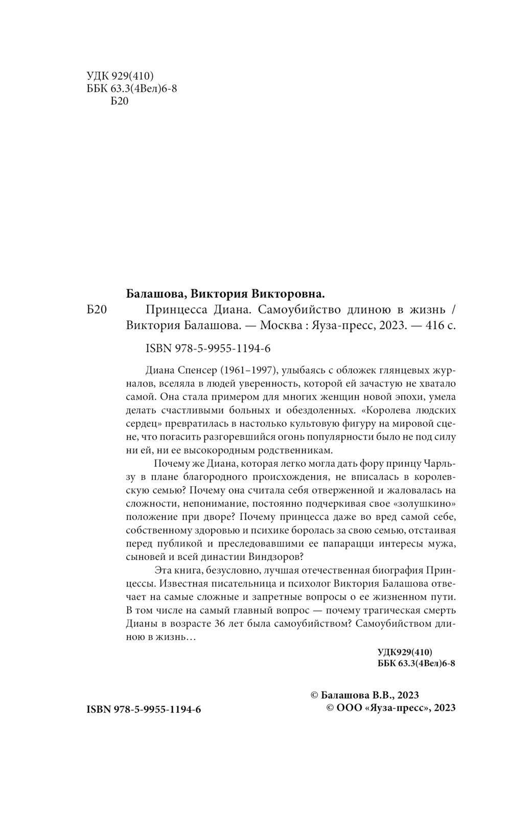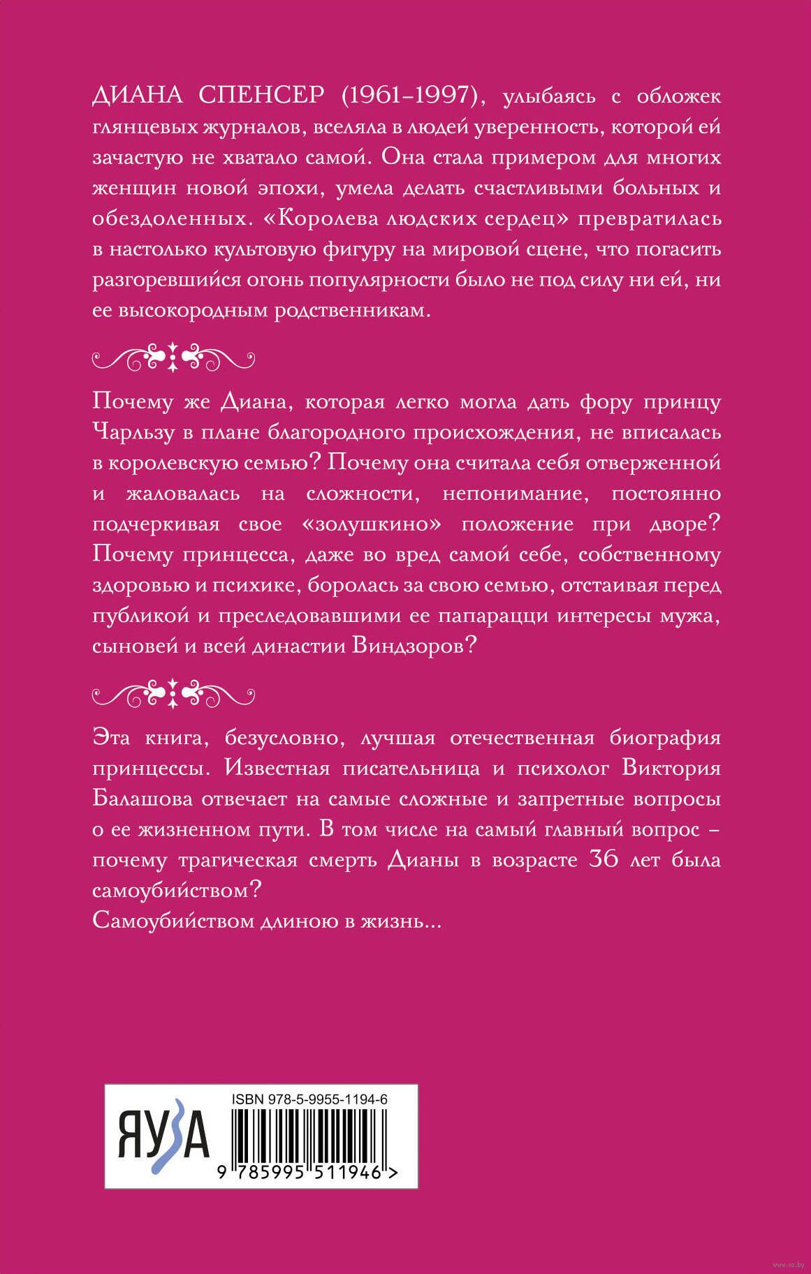 Известная писательница и психолог Виктория Балашова отвечает на самые сложные и запретные вопросы о ее жизненном пути. В том числе на самый главный вопрос – почему трагическая смерть Дианы в возрасте 36 лет была самоубийством? Самоубийством длиною в жизнь...