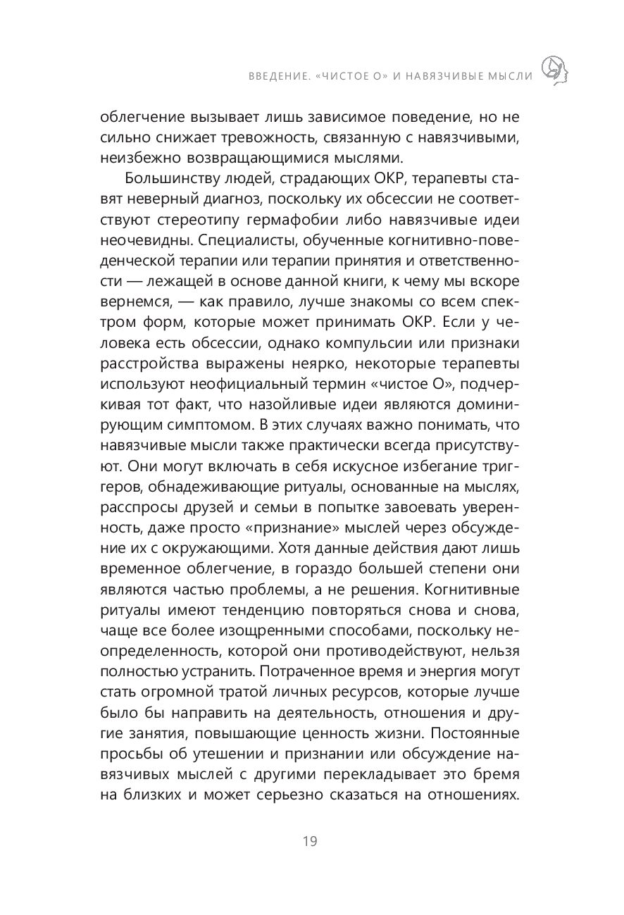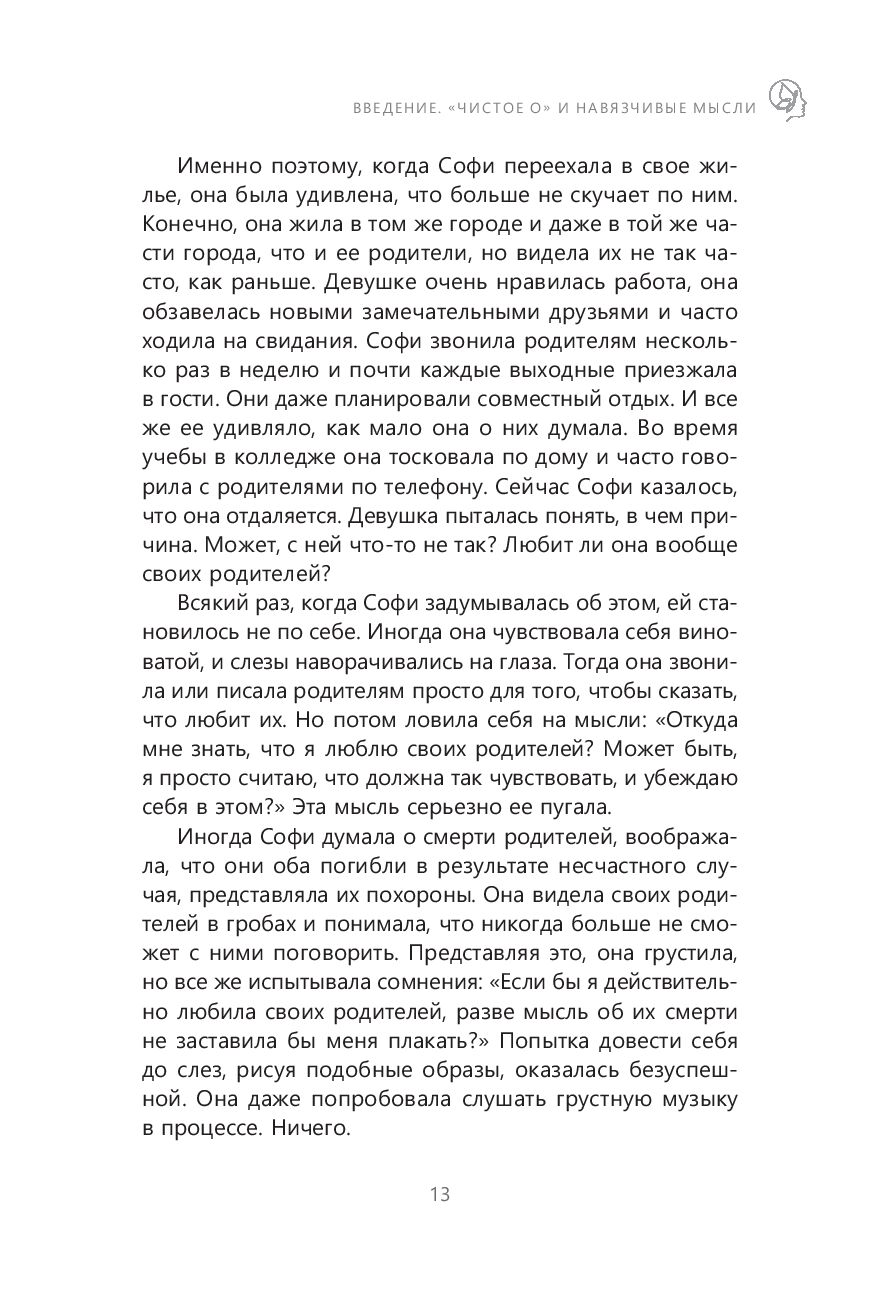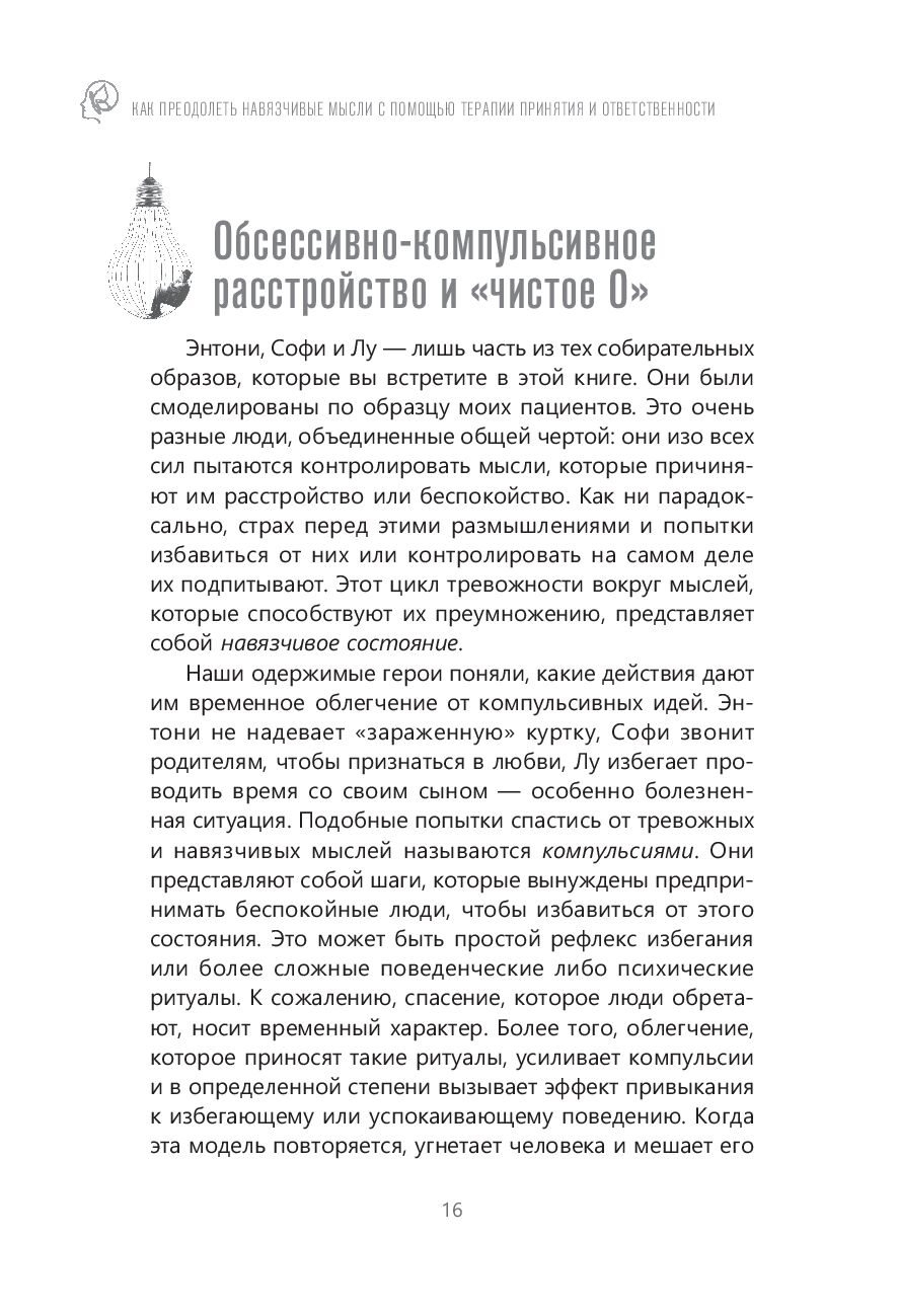 Автор книги предлагает свои методы борьбы с "чистым О" – при помощи терапии принятия и ответственности. Зачастую психологические методы борьбы с ОКР, к которым мы прибегаем, наоборот делают нежелательные мысли более сильными. Все потому, что мы сосредоточены на своих навязчивых идеях и постоянно размышляем о том, как с ними справиться. Эта книга противостоит такому подходу.