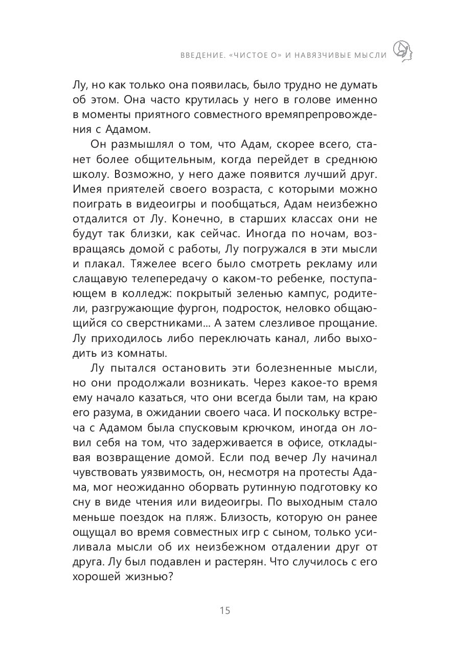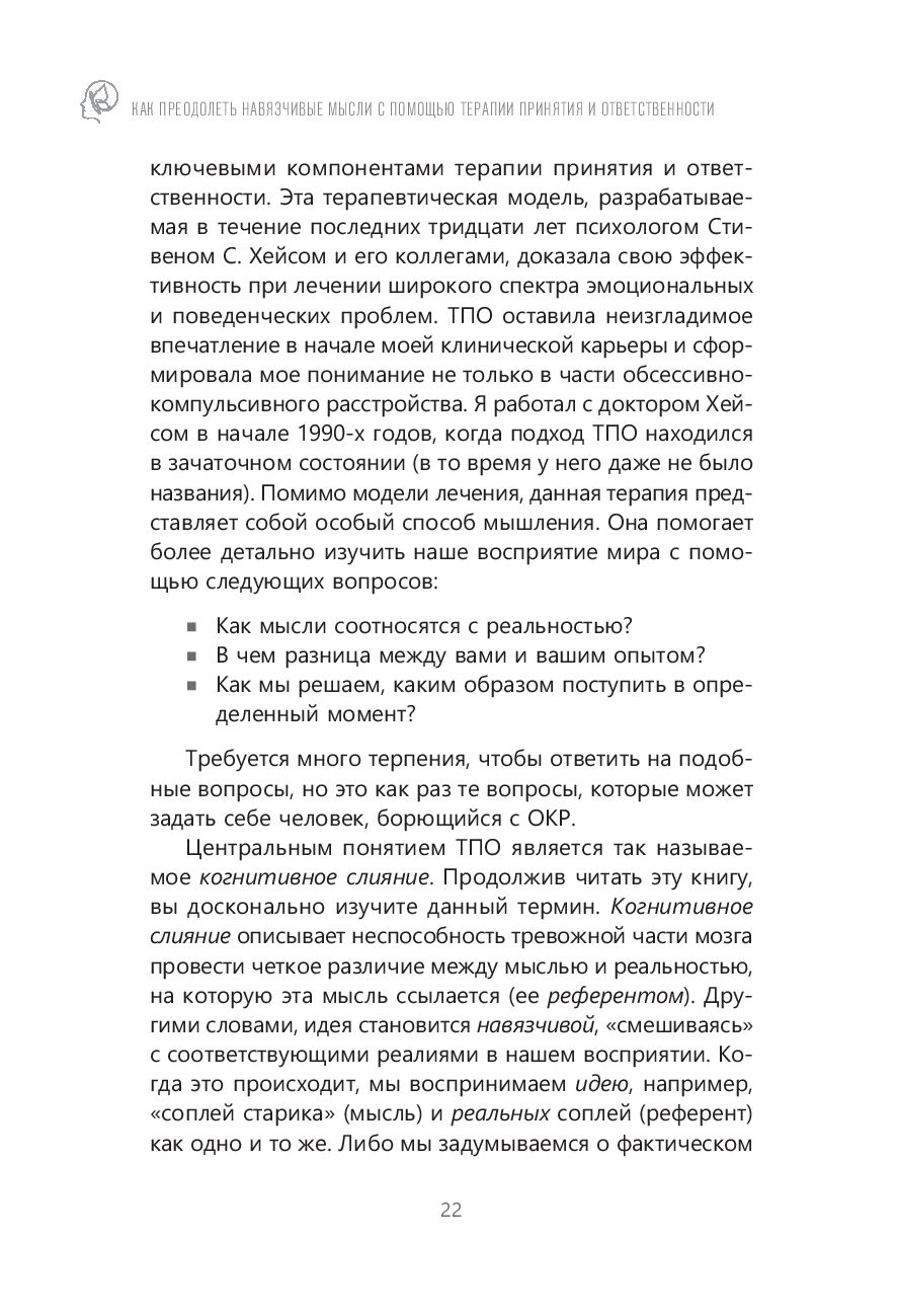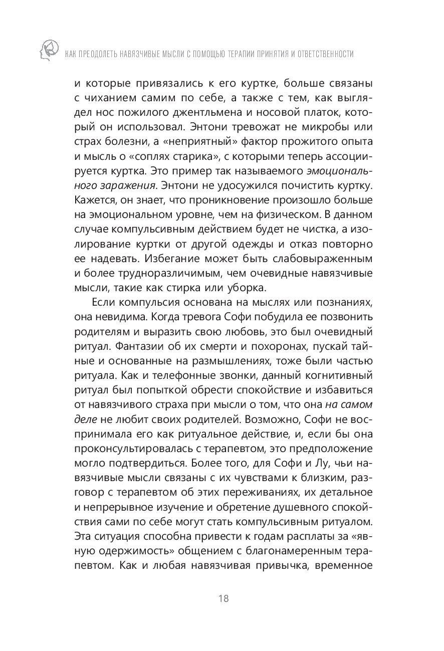 Автор книги предлагает свои методы борьбы с "чистым О" – при помощи терапии принятия и ответственности. Зачастую психологические методы борьбы с ОКР, к которым мы прибегаем, наоборот делают нежелательные мысли более сильными. Все потому, что мы сосредоточены на своих навязчивых идеях и постоянно размышляем о том, как с ними справиться. Эта книга противостоит такому подходу.