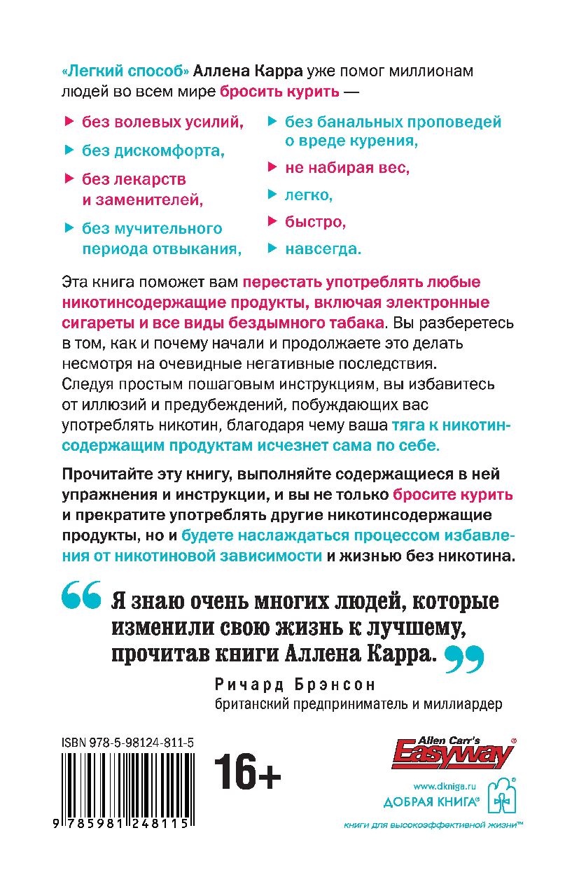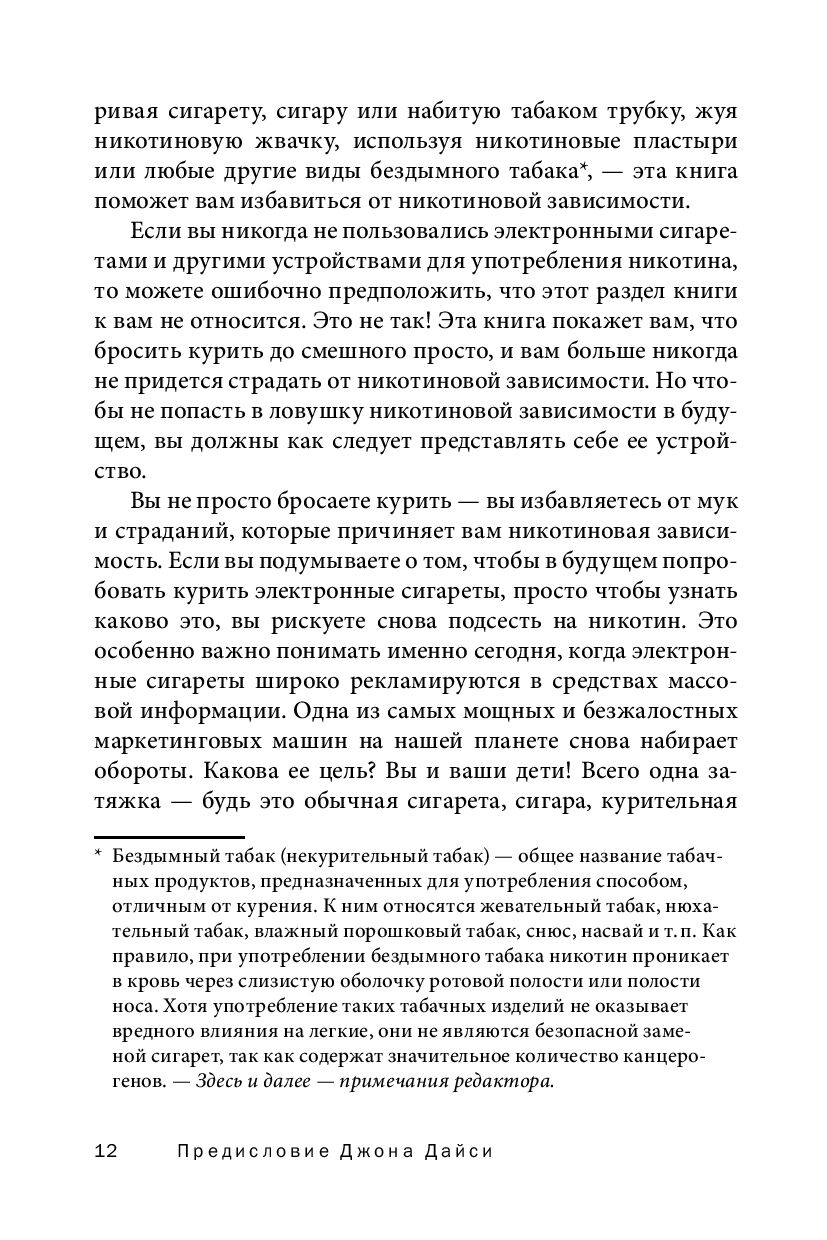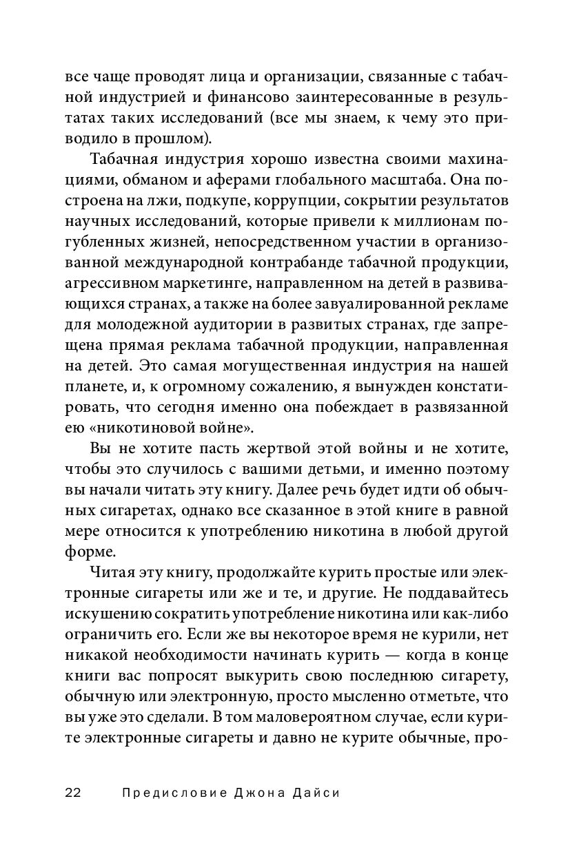 Эта интерактивная книга поможет вам перестать употреблять любые никотинсодержащие продукты, включая электронные сигареты и любые виды бездымного табака. Вы разберетесь в том, как и почему начали и продолжаете это делать несмотря на очевидные негативные последствия. Выполняя упражнения и следуя простым пошаговым инструкциям, вы избавитесь от иллюзий и предубеждений, побуждающих вас употреблять никотин, благодаря чему ваша тяга к никотинсодержащим продуктам исчезнет сама по себе.