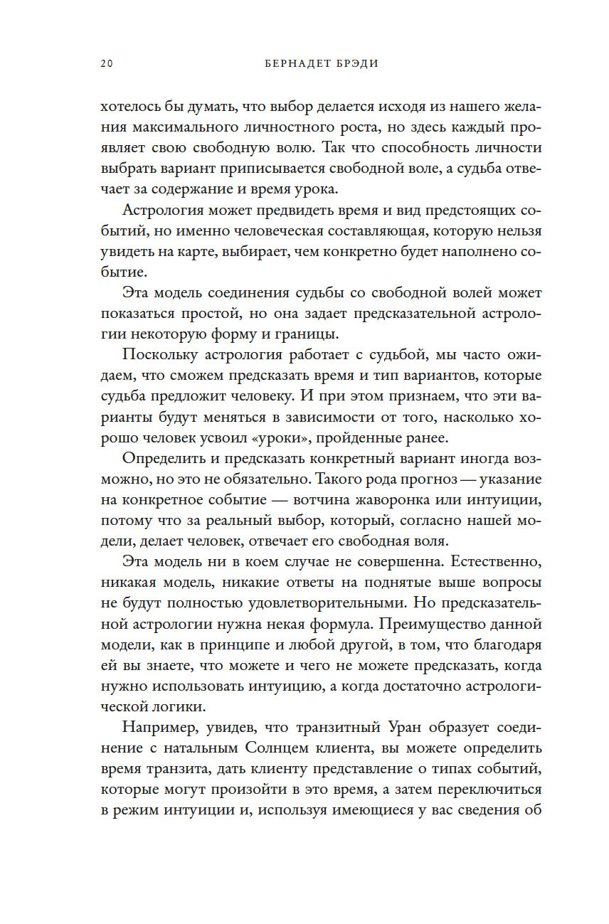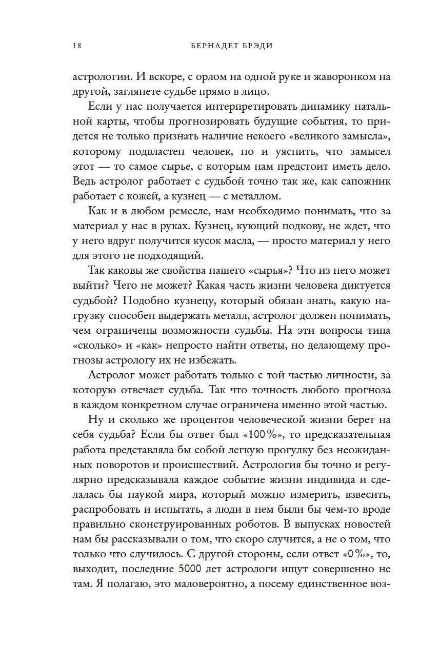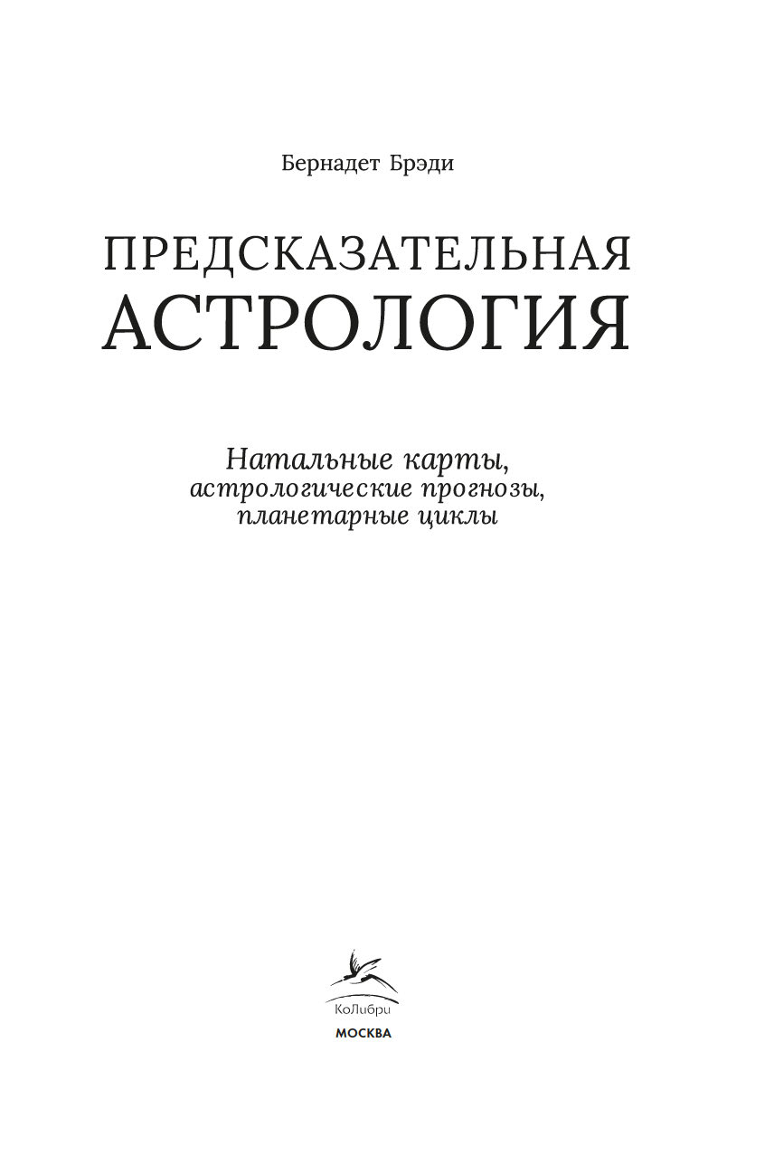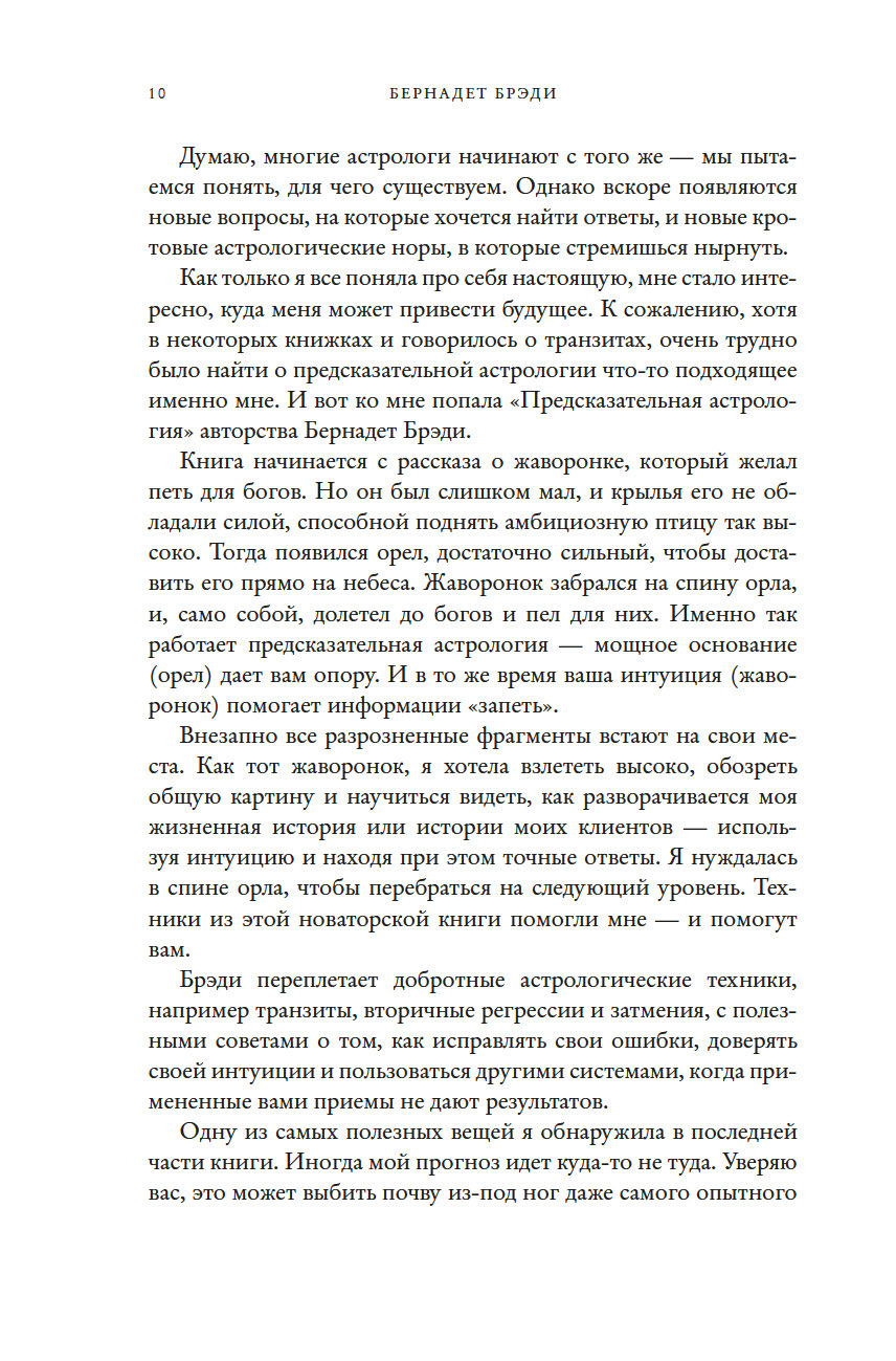 "Это неподвластный времени шедевр, который необходим любому, кто хочет расширить свои познания в этом предмете. Учиться лучше всего на практике, методом проб и ошибок, под чутким руководством хорошего учителя. Бернадет Брэди – один из лучших учителей в этой сфере. С данной книгой вы пройдете мастер-класс по пониманию того, как все устроено в предсказательной астрологии. Возможно, это поможет вам, читатель, увидеть роль судьбы в вашей жизни – и завербовать ее себе на службу. Вперед к вашему светлому будущему!" (Тереза Рид, практикующий эксперт в области карт Таро, "леди Таро")