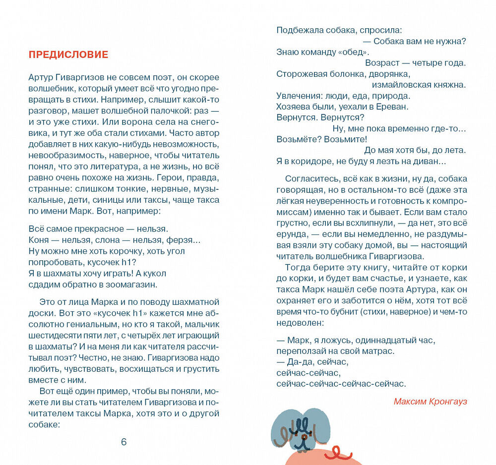 В сборник "Сейчас-сейчас-сейчас" вошли стихотворения Артура Гиваргизова на круглый год. Повседневная, но чудесная в своих деталях жизнь то трогает до слёз, то колет абсурдом. На радость всем читателям, сборник завершает цикл про таксу Марка, любимца публики. И всё – в иллюстрациях Светланы Муллари.