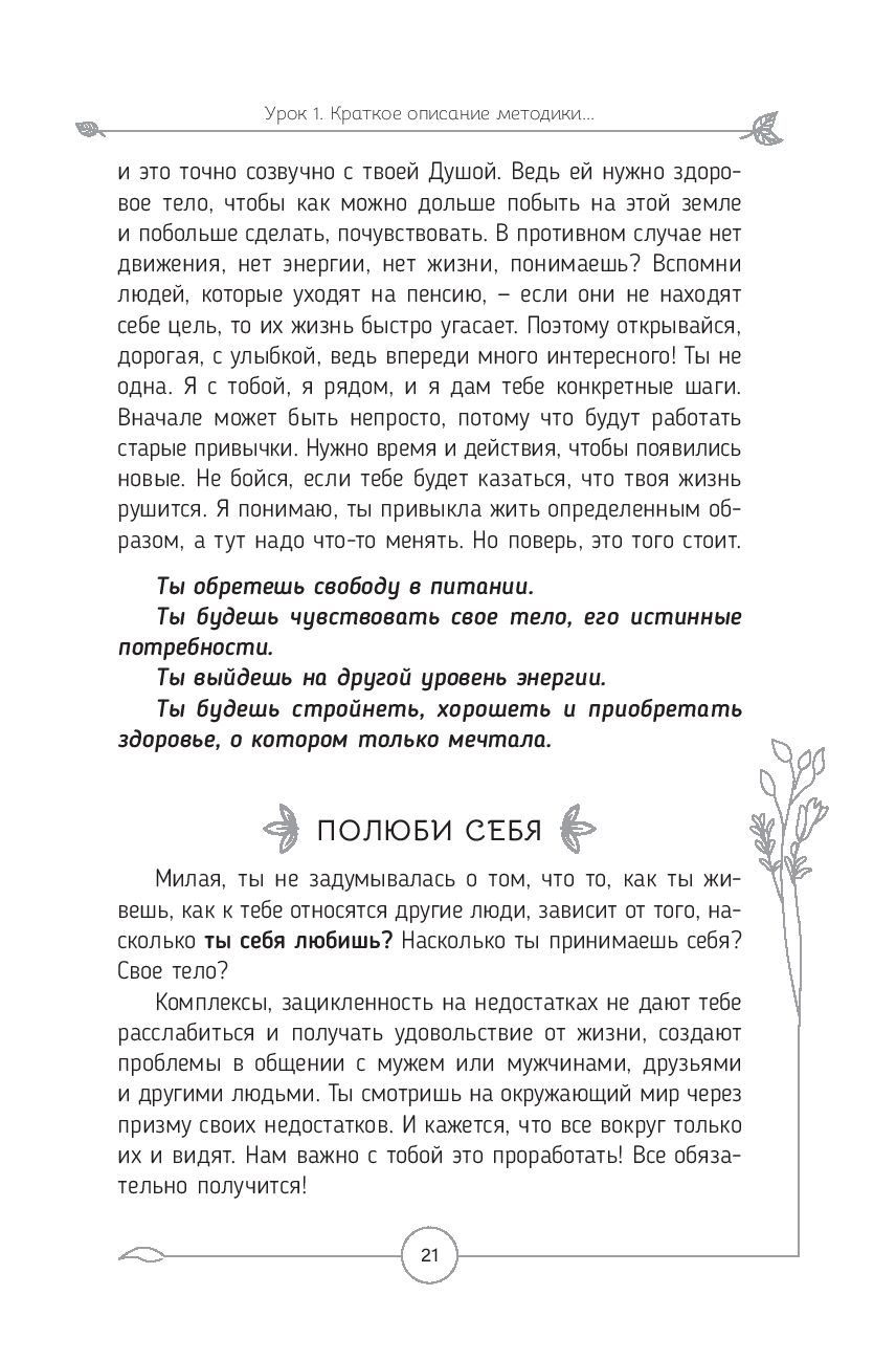 "У тебя в руках необычная книга – это книга-практикум, в которой я структурировала весь свой опыт и все свои знания. Именно они помогли мне, моей маме, а потом уже и другим женщинам через любовь к себе обрести здоровье, стройность и счастливую гармоничную жизнь.