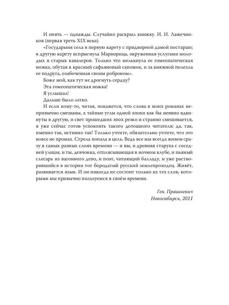 Романы Геннадия Прашкевича можно сравнить с музыкальными произведениями, так необычен ритм его прозы, так самобытен и глобален язык, – отзывались о "Секретном дьяке" и "Носоруком" литературные критики. Гул прошлого явственно доносится до наших дней. Только-только ещё задуман выход к Тихому океану, а приказной дьяк Иван Крестинин со товарищи уже идёт по бескрайним снегам Сибири, преодолевает громадные пространства, освещаемые лишь луной да северными сияниями, слышат гортанные голоса населяющих приполярный круг разноязычных племён; казалось бы, самые обыденные события становятся Историей.