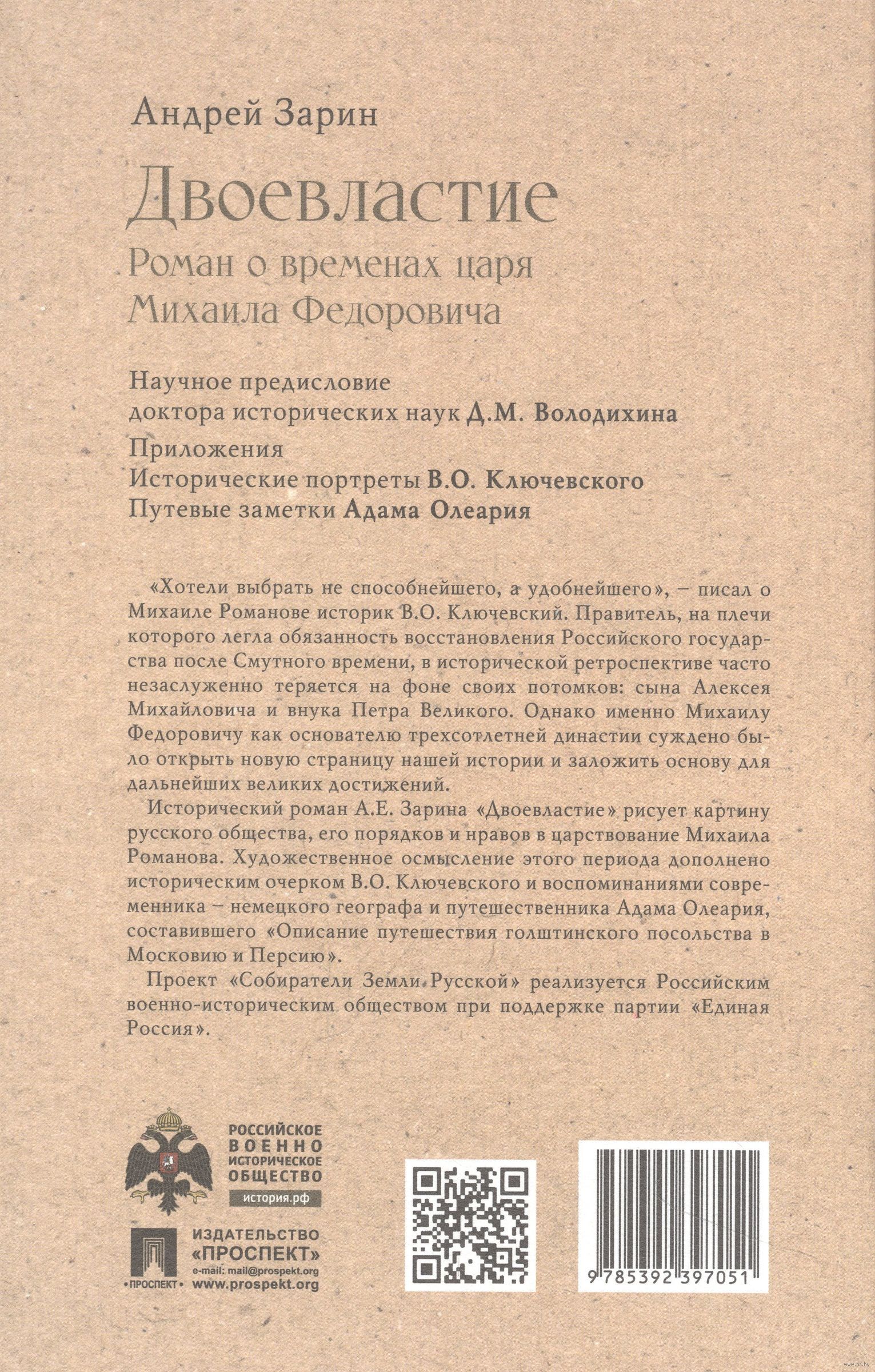 Исторический роман А.Е. Зарина "Двоевластие" рисует картину русского общества, его порядков и нравов в царствование Михаила Романова. Художественное осмысление этого периода дополнено историческим очерком В.О. Ключевского и воспоминаниями современника – немецкого географа и путешественника Адама Олеария, составившего "Описание путешествия голштинского посольства в Московию и Персию".