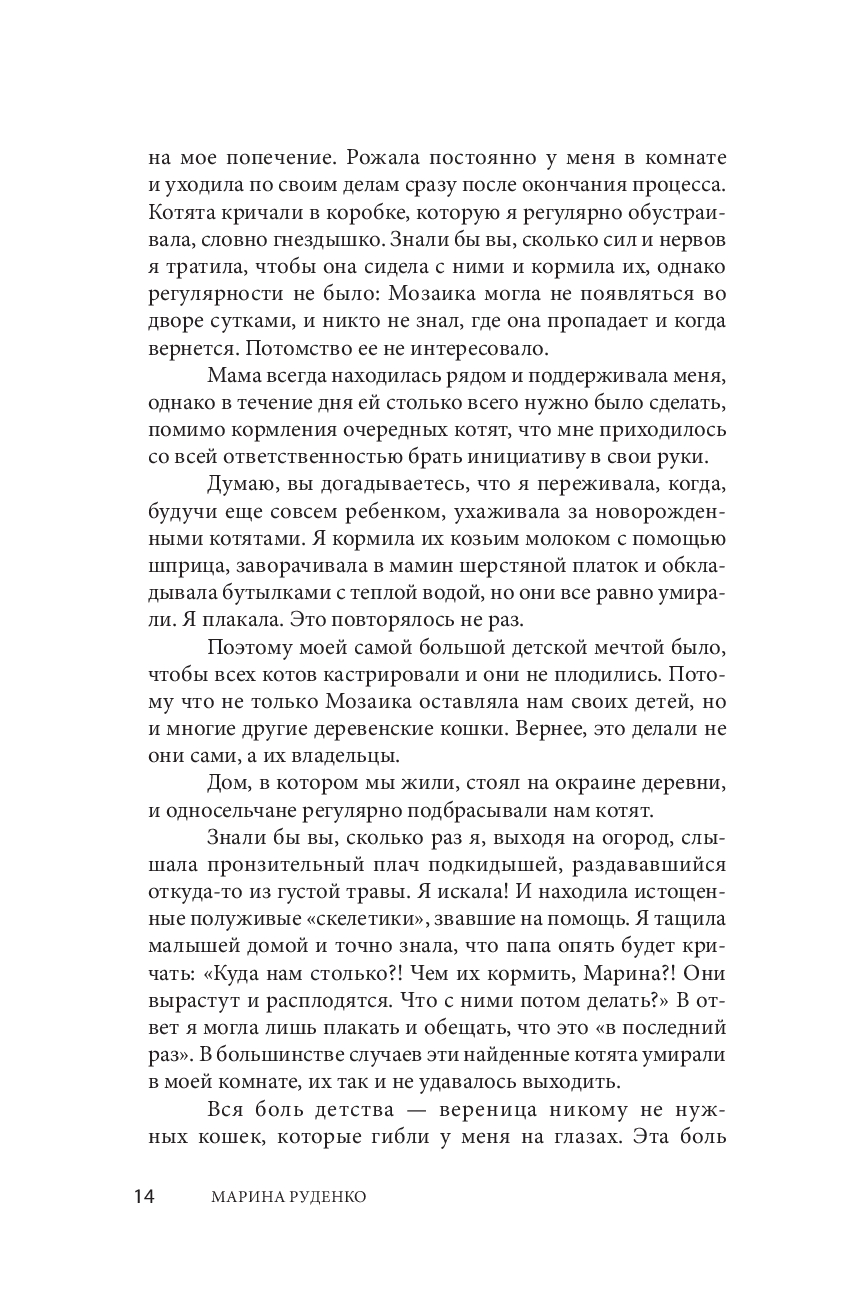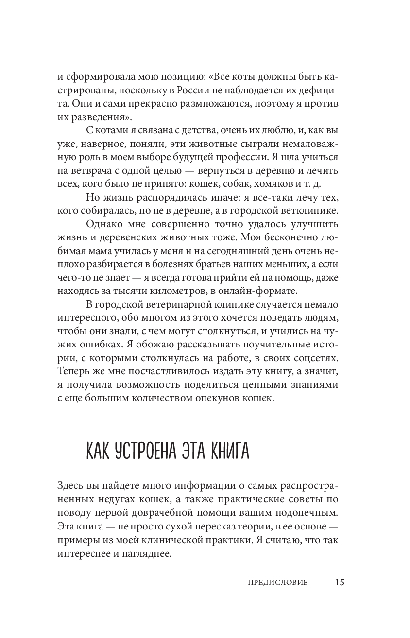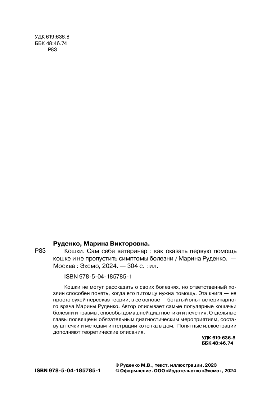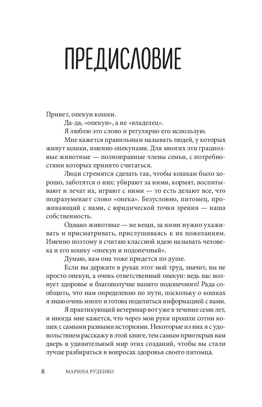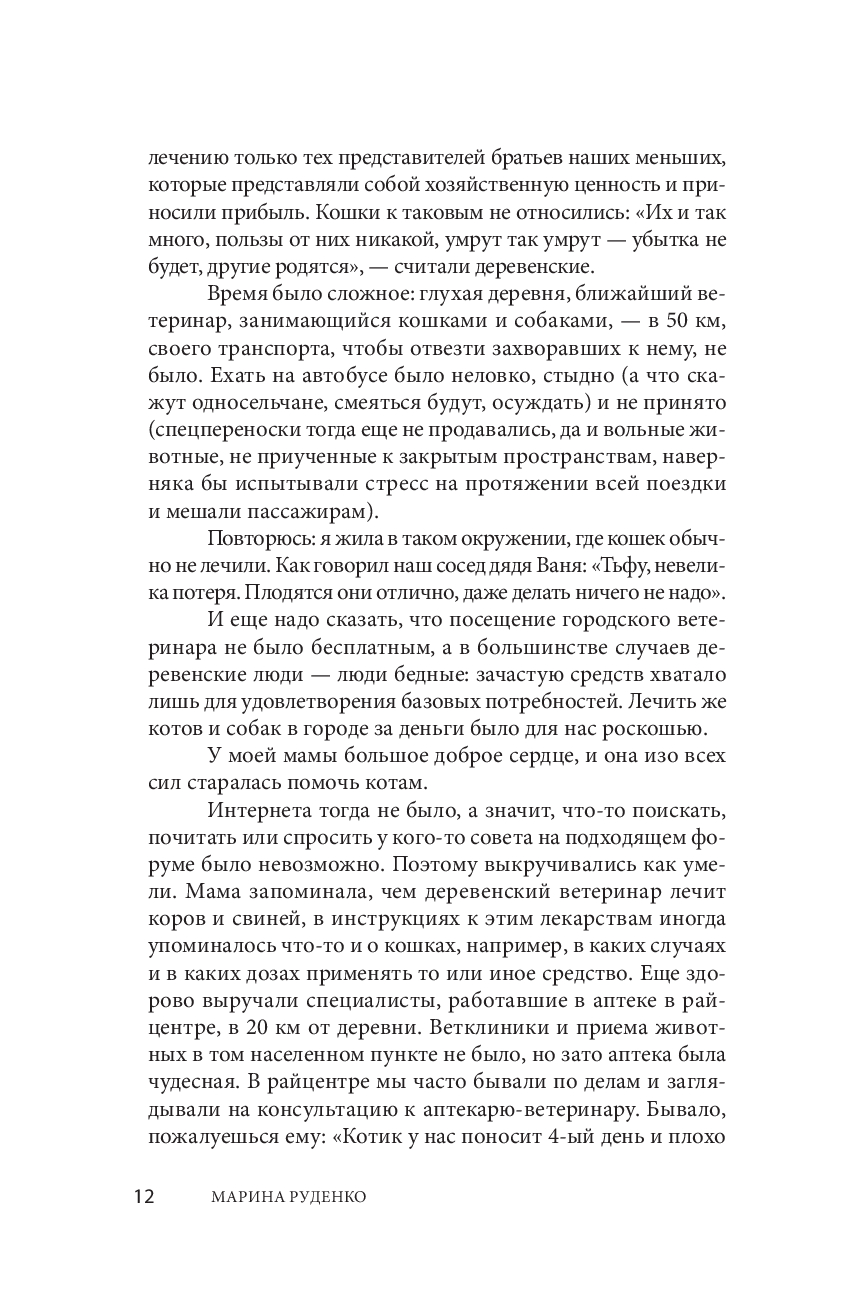 Кошки не могут рассказать о своих болезнях, но ответственный хозяин способен понять, когда его питомцу нужна помощь. Эта книга – не просто сухой пересказ теории, в ее основе – богатый опыт ветеринарного врача Марины Руденко. Автор описывает самые популярные кошачьи болезни и травмы, способы домашней диагностики и лечения. Отдельные главы посвящены обязательным диагностическим мероприятиям, составу аптечки и методам интеграции котенка в дом. Понятные иллюстрации дополняют теоретические описания.