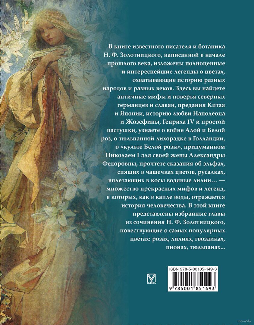 В книге известного писателя и ботаника Н. Золотницкого, написанной в начале прошлого века, изложены полноценные и интереснейшие легенды о цветах, охватывающие историю разных народов и разных веков. Здесь вы найдете античные мифы и поверья северных германцев и славян, предания Китая и Японии, историю любви Наполеона и Жозефины, Генриха IV и простой пастушки, узнаете о войне Алой и Белой роз, о тюльпанной лихорадке в Голландии, о "культе Белой розы", придуманном Николаем I для своей жены Александры Федоровны, прочтете сказания об эльфах, спящих в чашечках цветов, русалках, вплетающих в косы водяные лилии... – множество прекрасных мифов и легенд, в которых, как в капле воды, отражается история человечества.