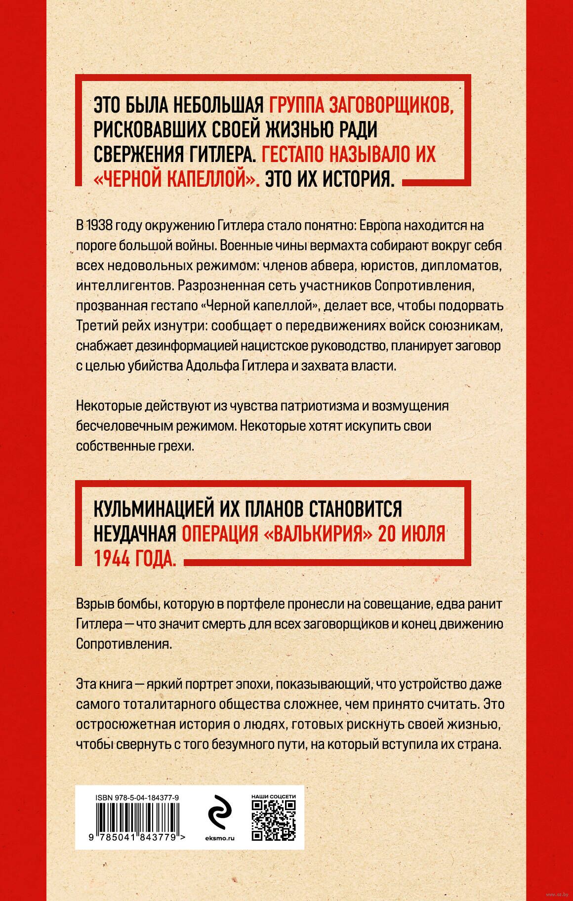 Кульминацией становится неудачная операция "Валькирия" 20 июля 1944 года. Взрыв бомбы, которую в портфеле пронесли на совещание, едва ранит Гитлера – что означает неминуемую смерть для всех заговорщиков. Увлекательная и остросюжетная, книга "Черная капелла" – это не только яркий портрет эпохи, но история о людях, готовых рискнуть своей жизнью, чтобы свернуть с того безумного пути, на который вступила их страна.