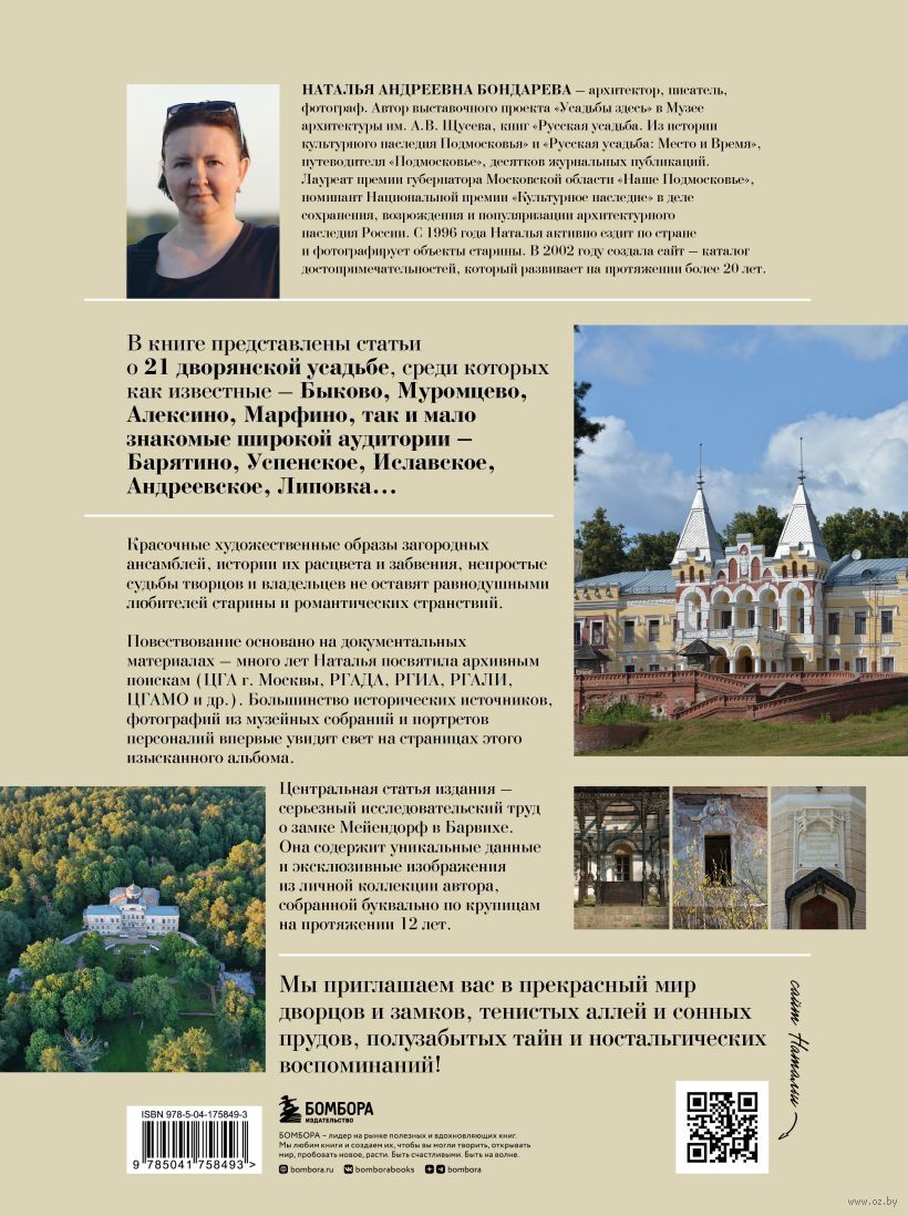 "Усадьбы России" – это издание, посвященное архитектурному и культурному наследию нашей страны. Автор книги Наталья Бондарева увлекательно повествует об истории как популярных, так и малоизвестных дворянских гнезд, расположенных в Подмосковье и других регионах Центральной России. Издание богато иллюстрировано авторскими снимками и старинными фотографиями из музейных и архивных коллекций. Многие сведения, документы и изображения публикуются впервые.