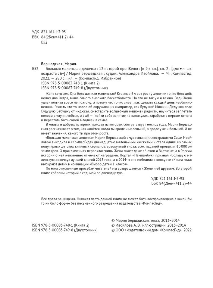 "Большая маленькая девочка" Марии Бершадской с чудесными иллюстрациями Саши Ивойловой выходила в "КомпасГиде" двенадцатью маленькими книжками и стала одним из самых популярных детских книжных сериалов: совокупный тираж всех изданий превысил 60 000 экземпляров. О приключениях первоклассницы Жени знают даже в Чехии и Вьетнаме, а в России истории о ней неизменно отмечают наградами. Портал "Пампамбук" признал "Большую маленькую девочку" лучшей книгой 2013 года, а в 2014-м она победила в конкурсе "Книга года: выбирают дети" в номинации "Выбор детей 1 класса".