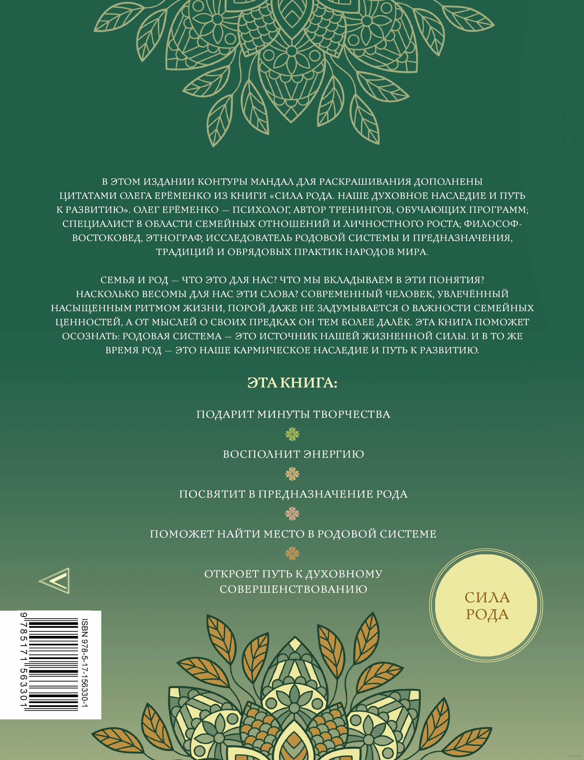 В этом издании контуры мандал для раскрашивания дополнены цитатами Олега Ерёменко из книги "Сила рода. Наше духовное наследие и путь к развитию".
