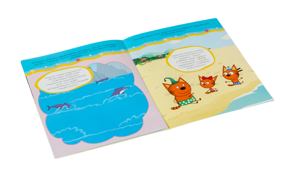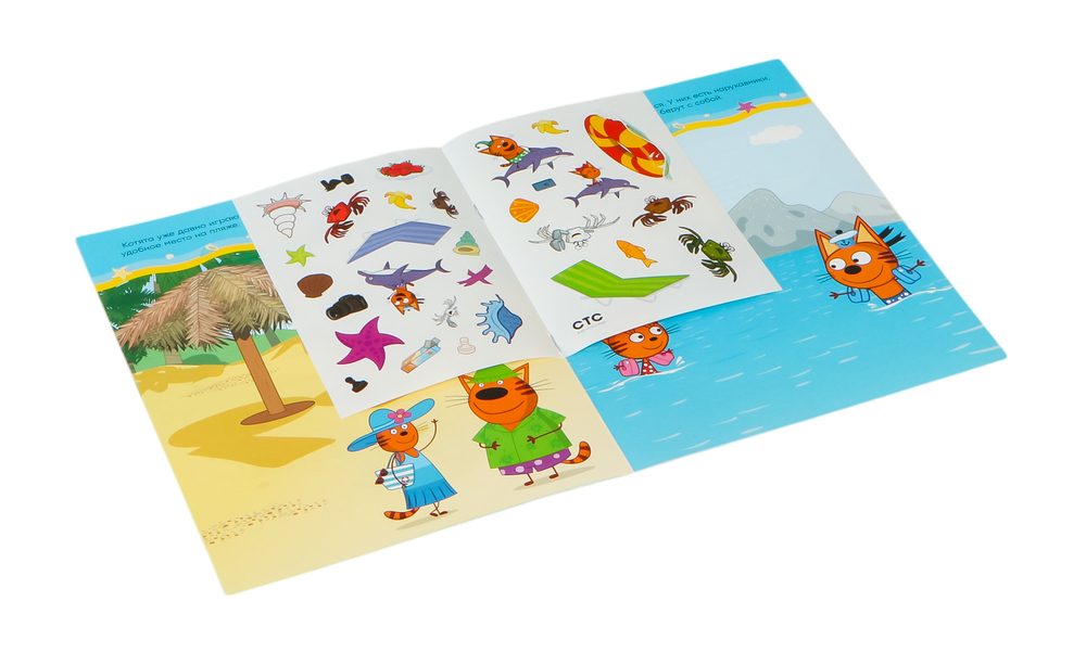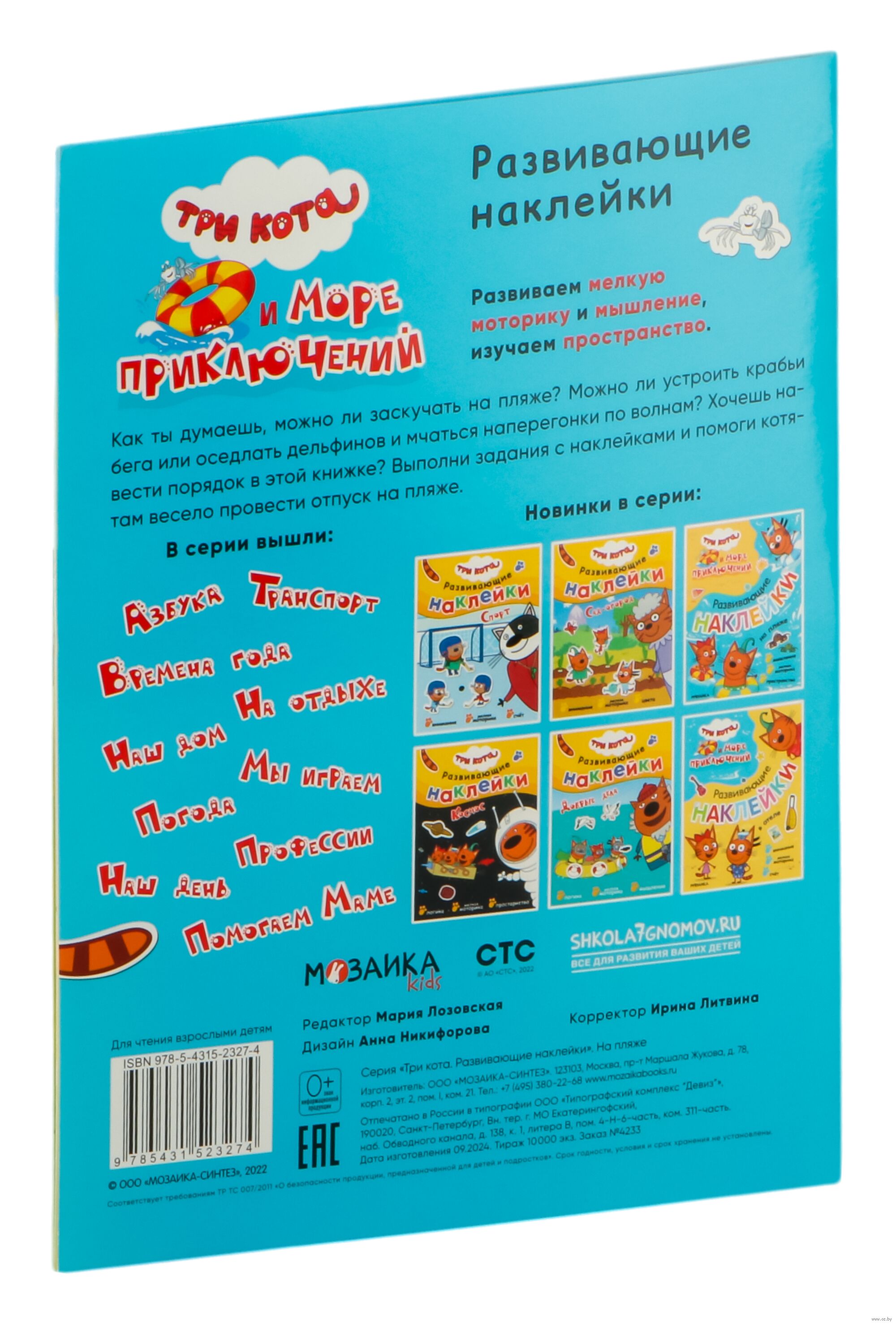 Захватывающие приключения трех котов, знакомства с новыми героями и многоразовые наклейки, а также увлекательные задания на развитие пространственного мышления – все это внутри книги «На пляже» из серии "Три кота. Развивающие наклейки".