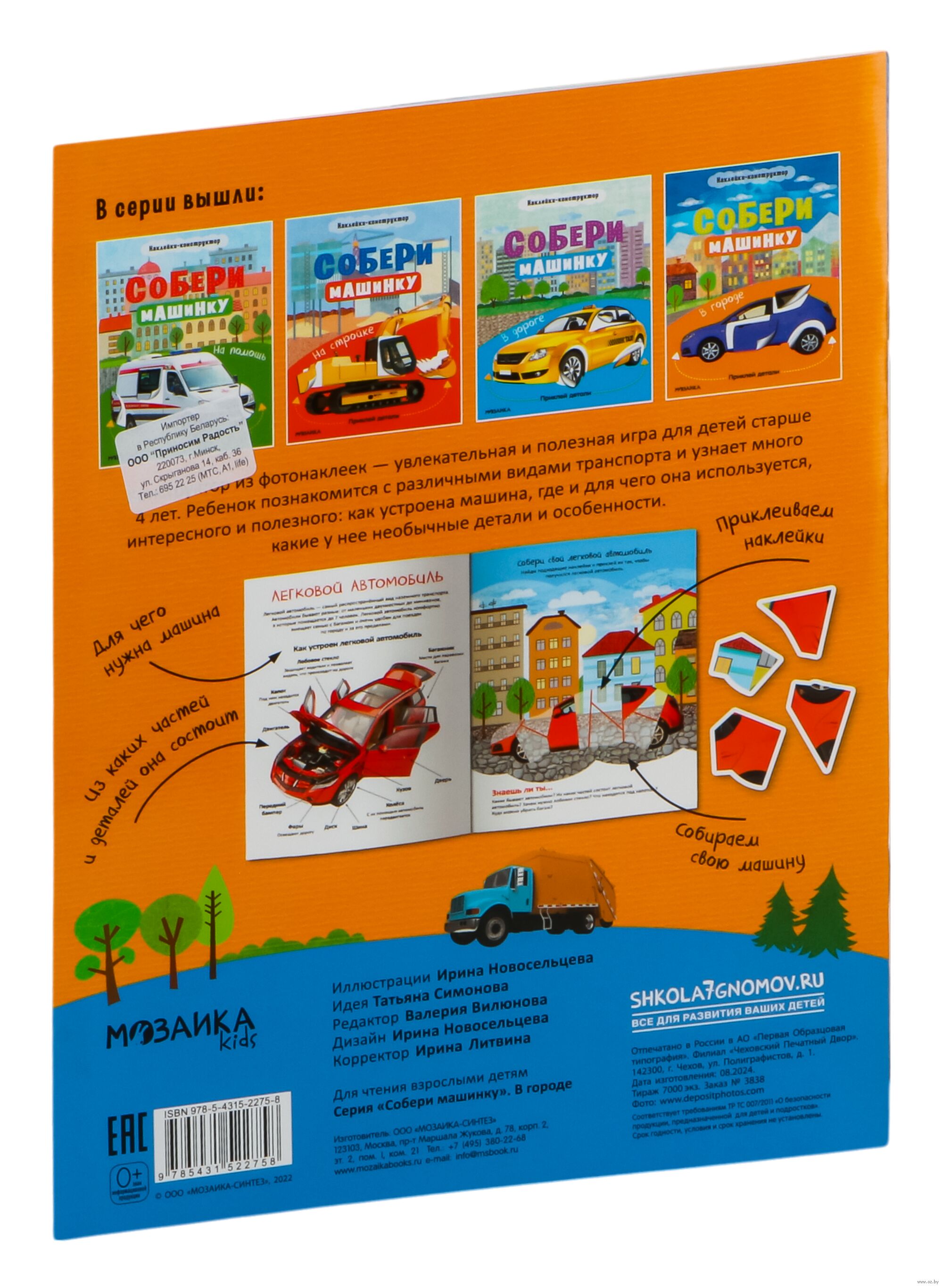 Книга "В городе" серии "Собери машинку" – это необычный конструктор из фотонаклеек. Доклеивая недостающие части на фотографии машин, ребенок не только познакомится различными видами транспорта, но и узнает много интересного и полезного: как устроен легковой автомобиль, почему мусоровозы бывают разных цветов, какие необычные детали и особенности позволяют легко узнать поливальную машину. Закрепить полученные знания помогут вопросы и задания на каждом развороте.