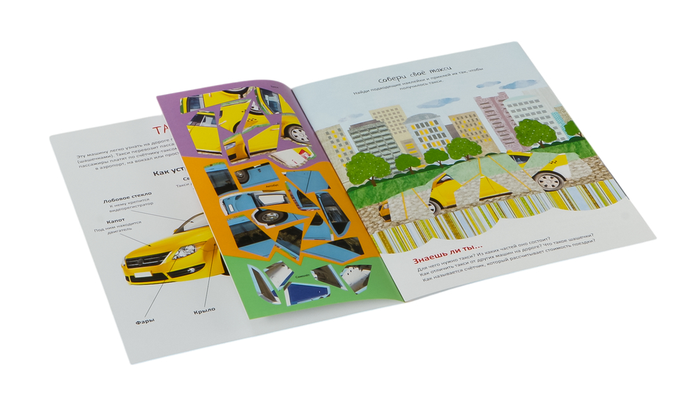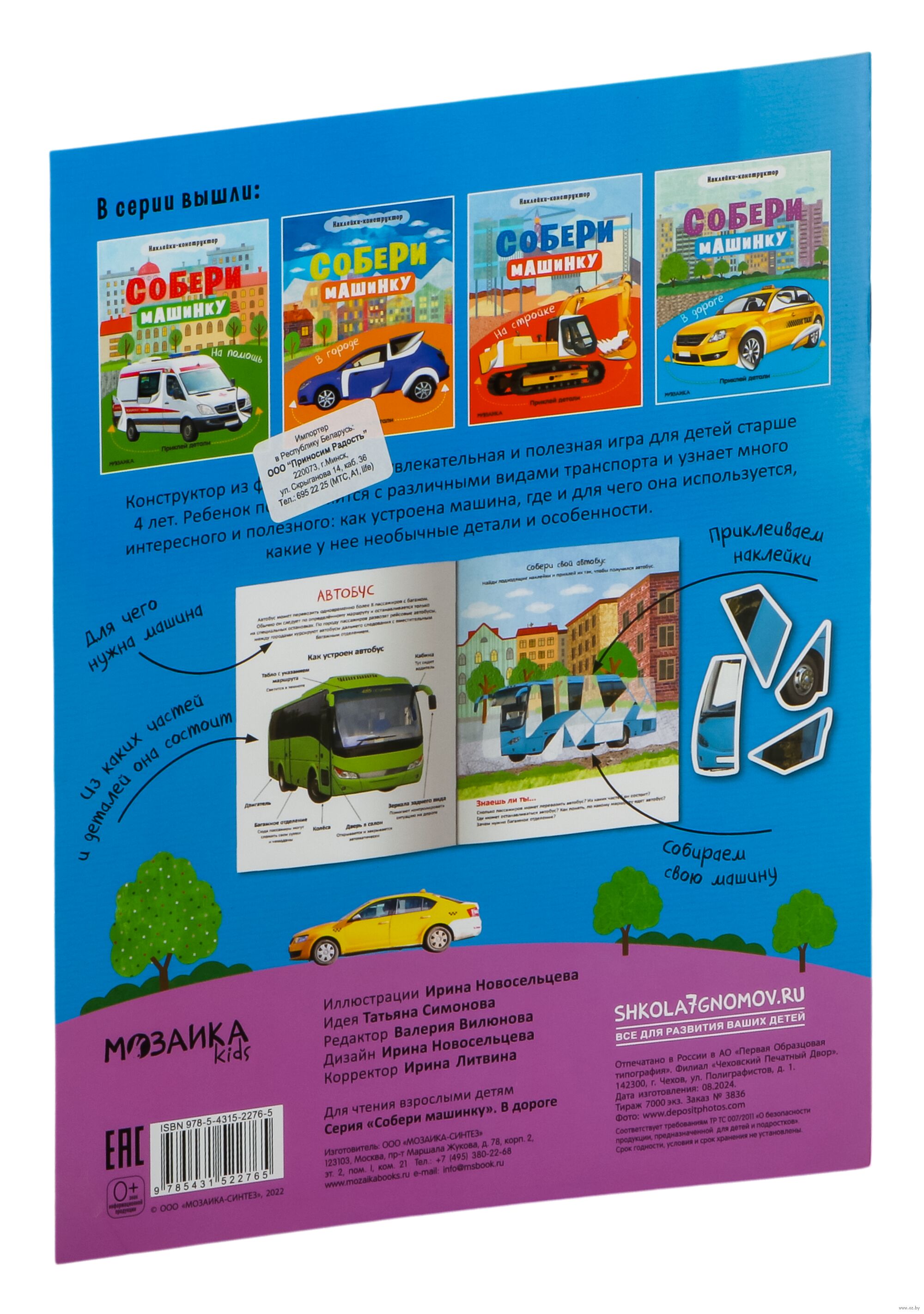 Книга "В дороге" серии "Собери машинку" – это необычный конструктор из фотонаклеек. Доклеивая недостающие части на фотографии машин, ребенок не только познакомится различными видами транспорта, но и узнает много интересного и полезного: как устроен круизный лайнер, зачем самолету крылья, какие необычные детали и особенности позволяют легко узнать такси. Закрепить полученные знания помогут вопросы и задания на каждом развороте.