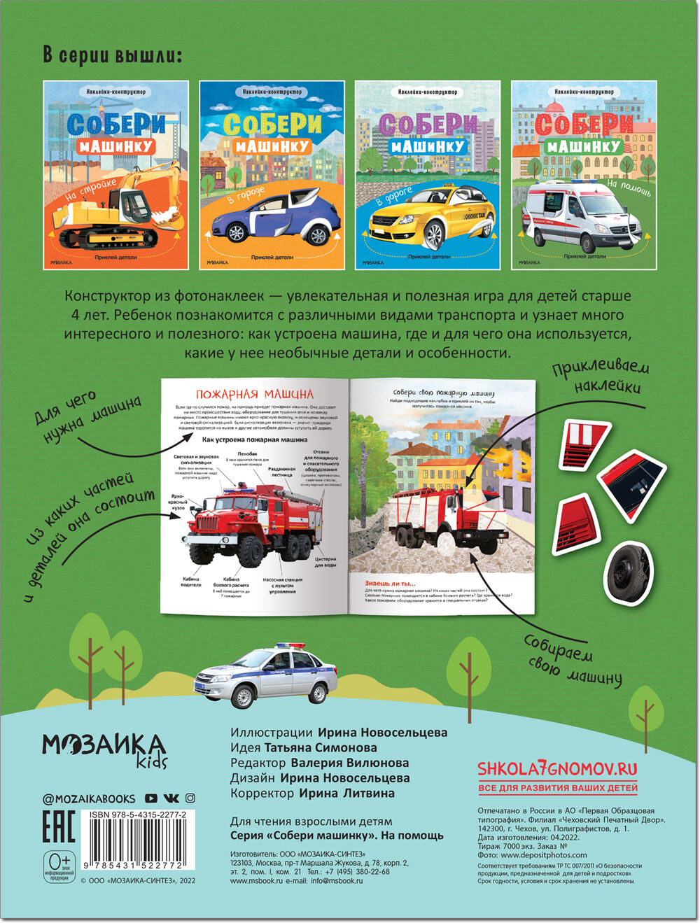 Книга "На помощь" серии "Собери машинку" – это необычный конструктор из фотонаклеек. Доклеивая недостающие части на фотографии машин, ребенок не только познакомится различными видами транспорта, но и узнает много интересного и полезного: как устроен автомобиль скорой помощи, что умеет пожарная машина, какие необычные детали и особенности позволяют легко узнать полицейский автомобиль. Закрепить полученные знания помогут вопросы и задания на каждом развороте.
