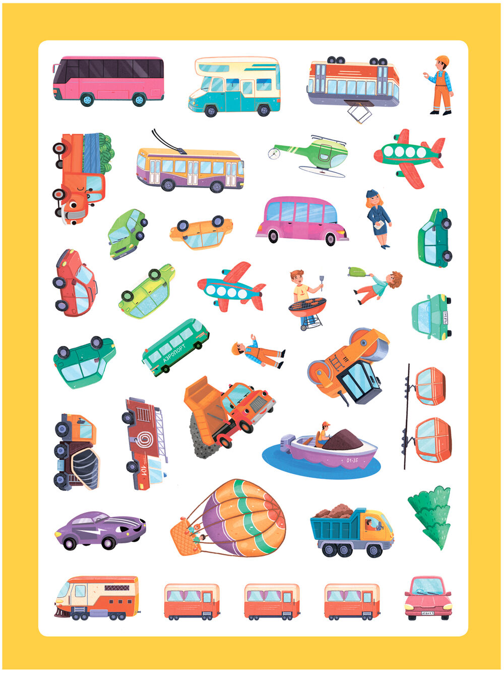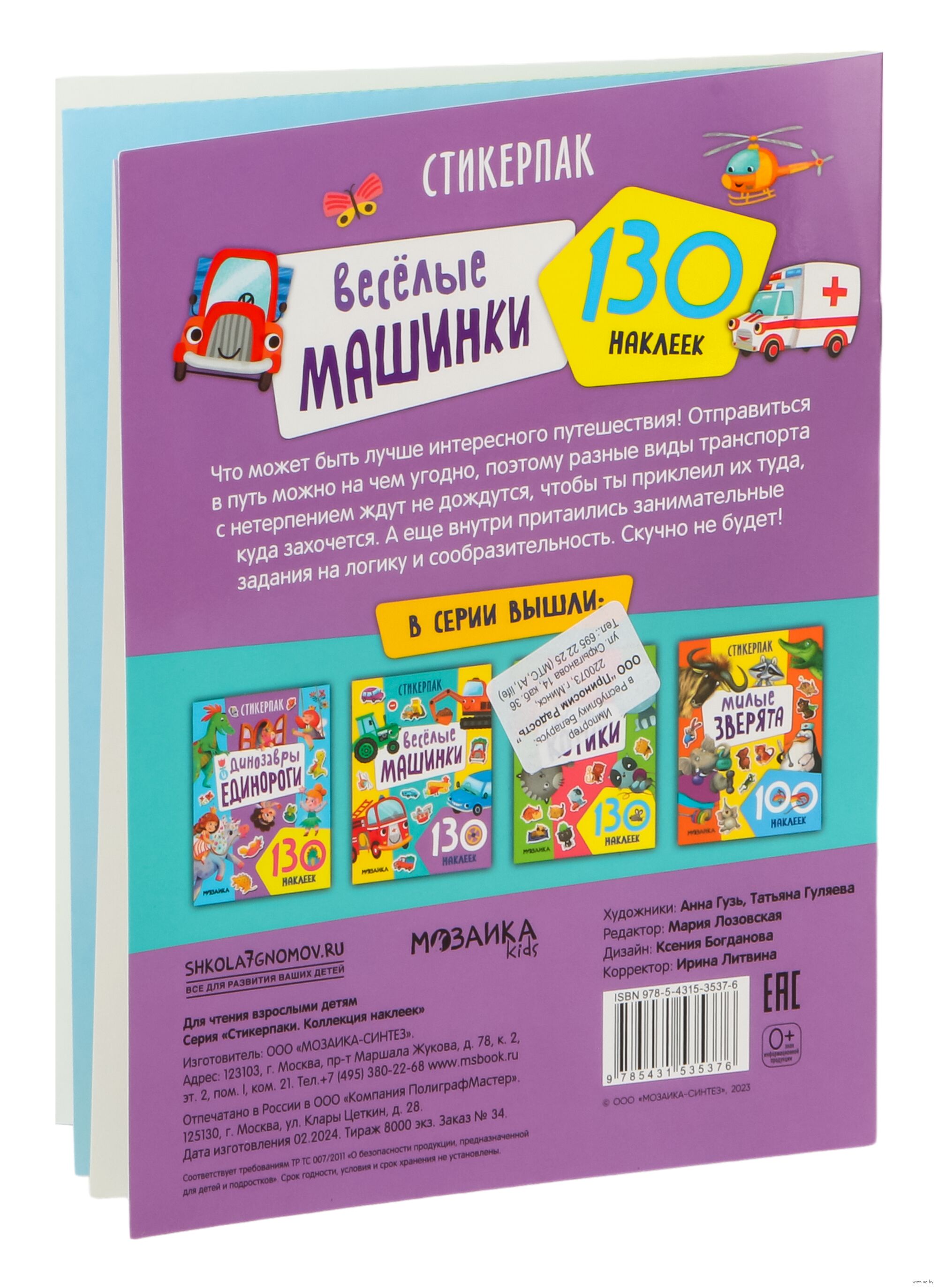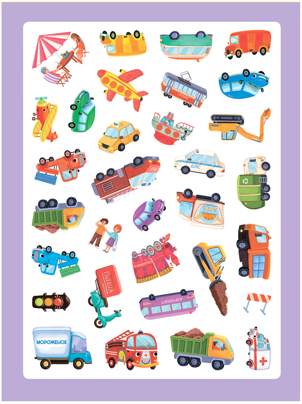 "Веселые машинки" серии "Стикерпаки. Коллекция наклеек" – это 130 наклеек с разными видами транспорта: машины, поезда, самолеты, корабли. Можно даже собрать длинный поезд из вагончиков-наклеек.