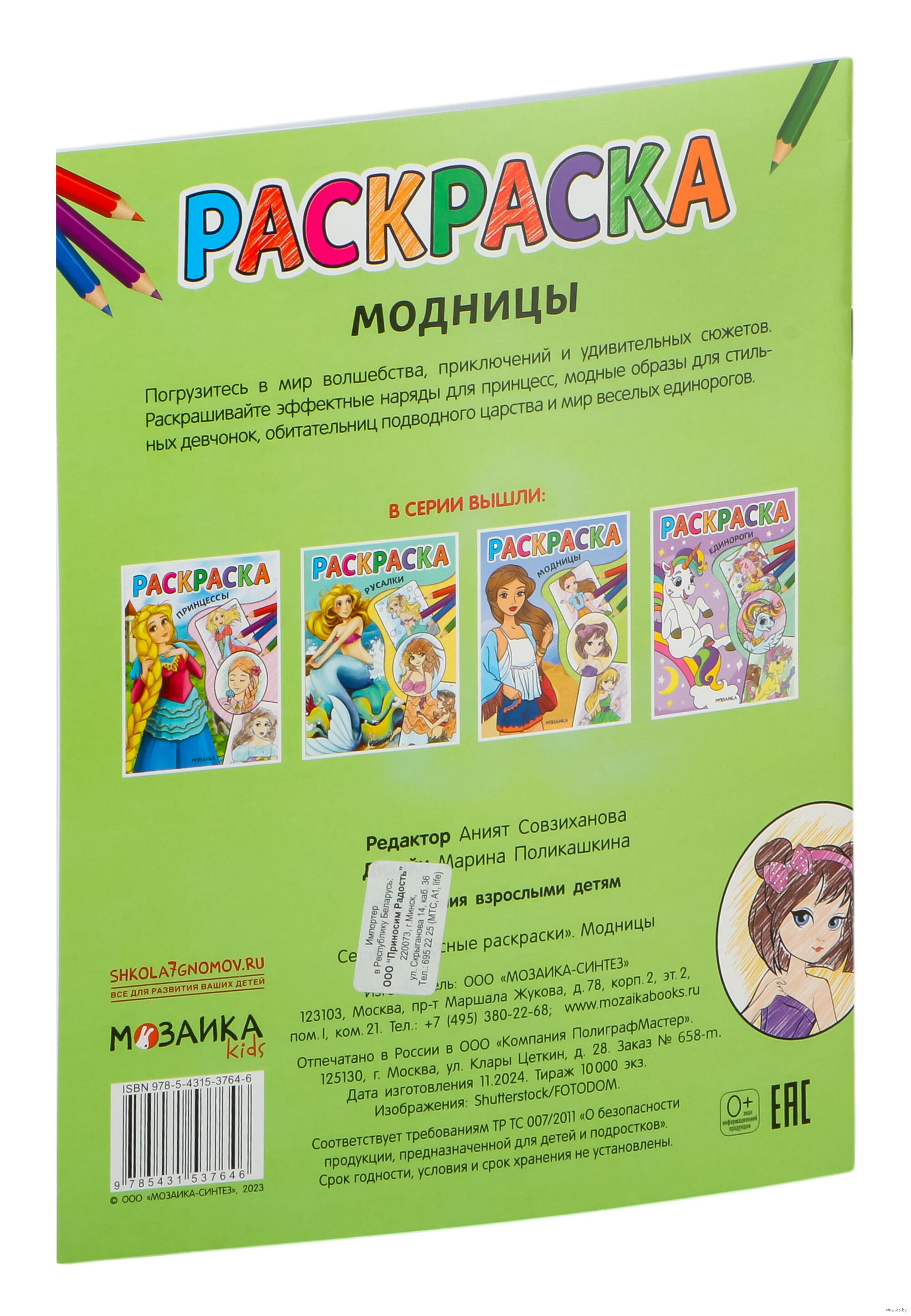 Книга "Модницы" серии "Классные раскраски" – путешествие в мир красоты, роскоши и стиля для детей от 5 лет. У ребенка появится возможность побыть стилистом, раскрашивая элегантные наряды, аксессуары и прически.