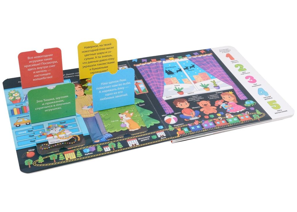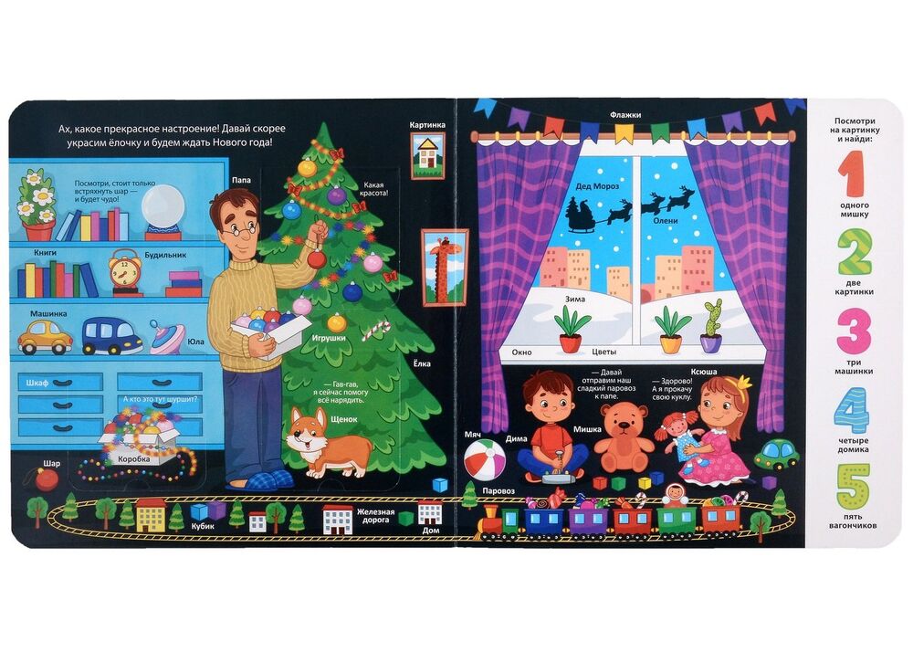 Яркие картинки надолго задержат внимание малыша, а слова в окошках помогут расширить словарный запас и развить память. На каждом развороте приготовлено интересное задание на смекалку и внимательность. Играйте, читайте, учите новые слова, погружайтесь в новогоднюю атмосферу и заряжайтесь отличным настроением!
