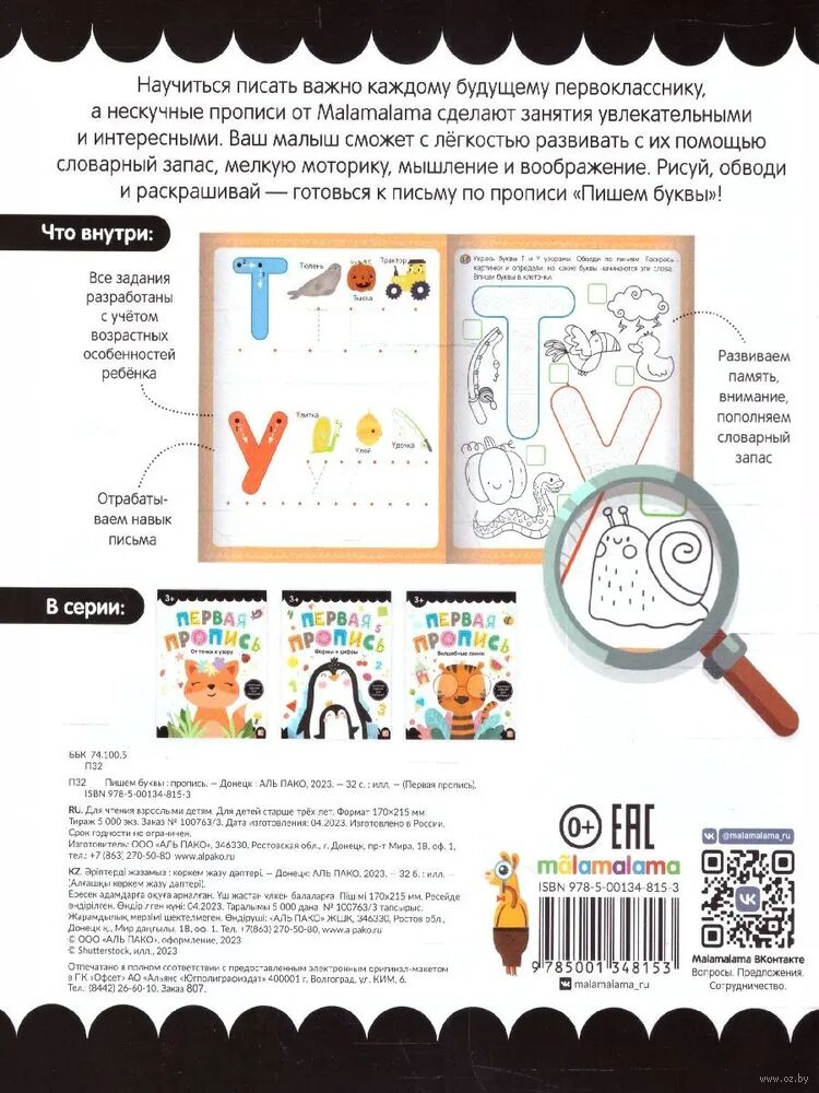 Научиться писать важно каждому будущему первокласснику, а нескучная серия "Первые прописи" сделает занятия увлекательными и интересными. Ваш малыш сможет с лёгкостью развивать с их помощью словарный запас, мелкую моторику, мышление и воображение. Рисуй, обводи и раскрашивай – готовься к письму по прописи "Пишем буквы"!