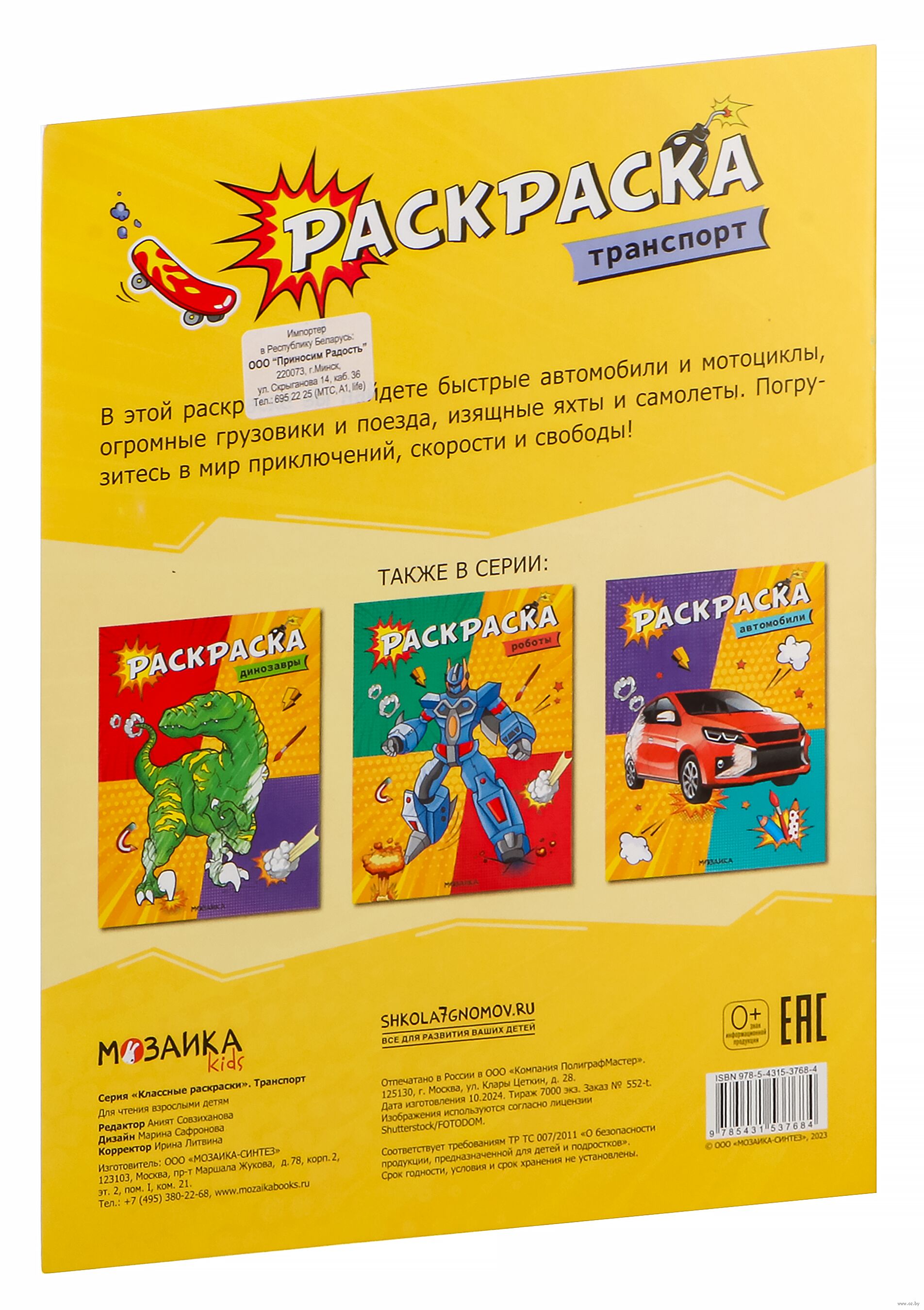 Книга "Транспорт" серии "Классные раскраски" – захватывающее путешествие для детей от 5 лет. На страницах ребенка ждут быстрые автомобили и мотоциклы, огромные грузовики и поезда, изящные яхты и самолеты.