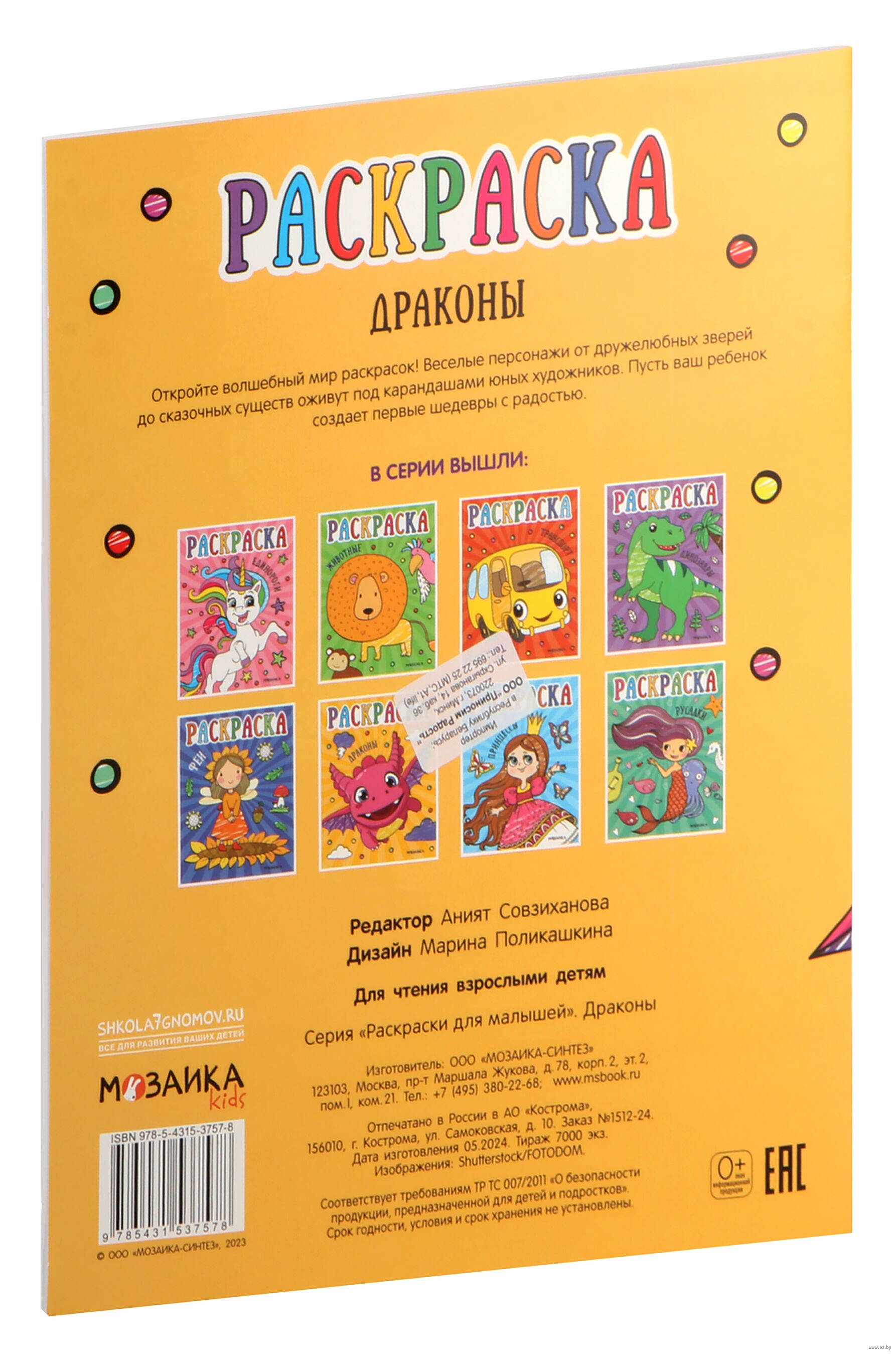 Книга "Драконы" серии "Раскраски для малышей" – путешествие в мир мифических созданий для детей от 3 лет. Ребенок сможет оживить необычных драконов, раскрашивая их огромные крылья, замысловатую чешую и могучие хвосты.