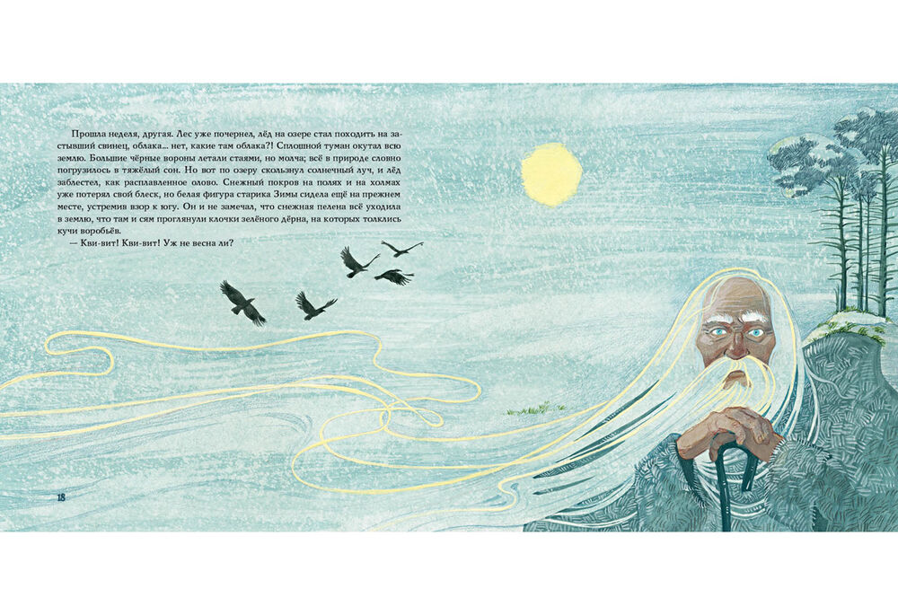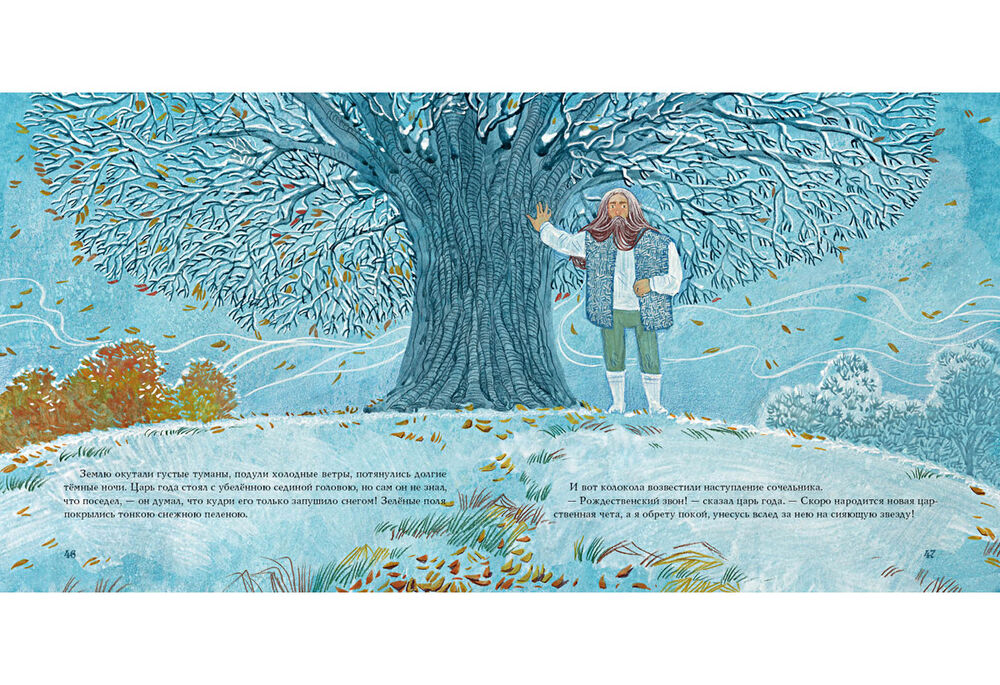 Однажды один старый воробей заметил, что Новый год наступает с приходом весны. А весна приходит, когда прилетают аисты. И вот приходит весна, а вместе с ней два аиста приносят на своих спинах детей – мальчика и девочку. Дети растут, и природа оживает, наполняясь силами. Распускаются цветы, зеленеют рощи, солнце согревает землю? Наступает лето, юноша становится статным мужчиной, а девушка – прекрасной женщиной, его женой. Наливаются соком плоды, желтеют хлебные колосья? Наконец леса одеваются золотом, наступают холода, и жена повелителя года уходит на покой. А сам он, теперь седовласый старик, укрывает землю снегом и смотрит вдаль с высокого холма, терпеливо ожидая прихода новой четы?