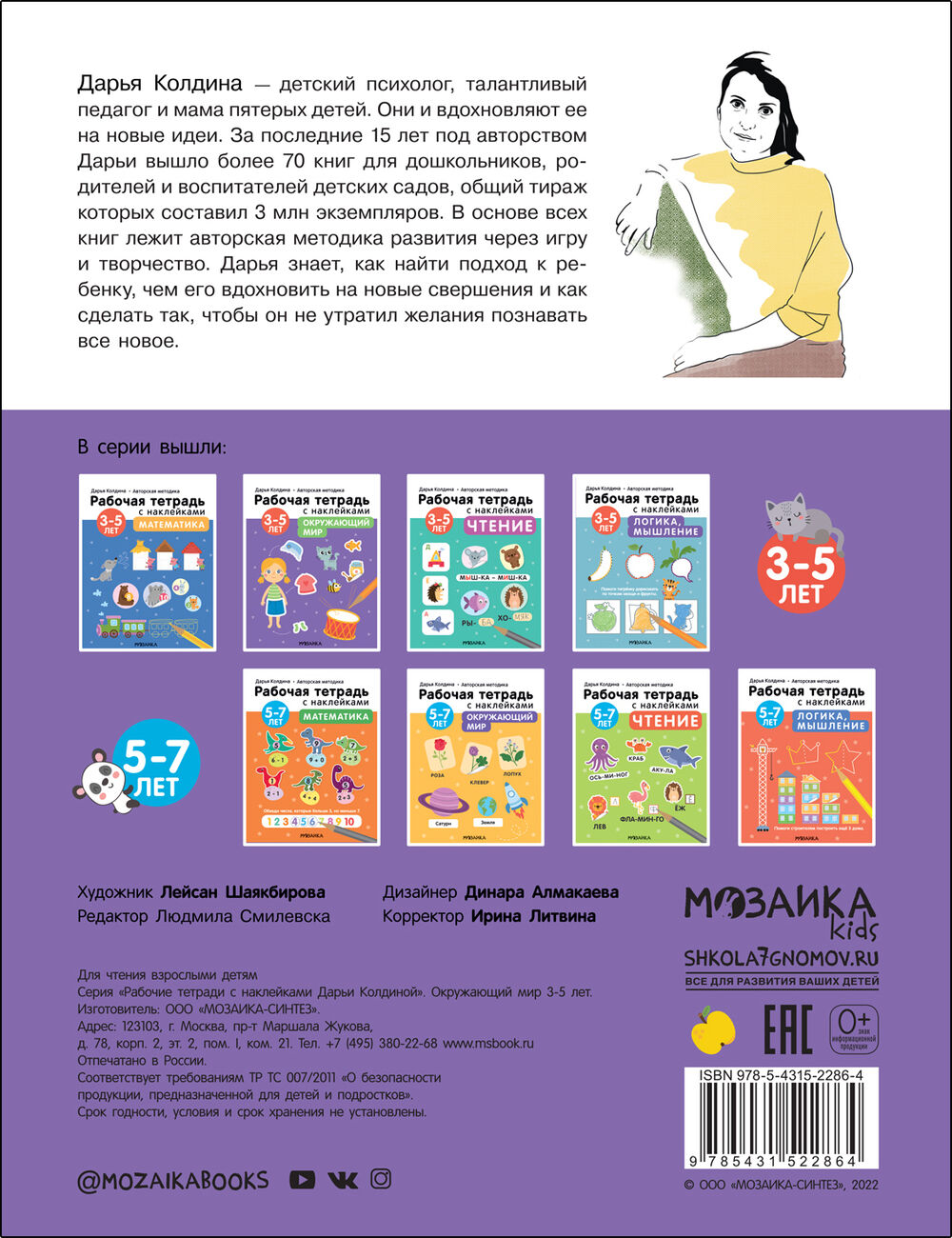 Рабочая тетрадь "Окружающий мир 3-5 лет" из серии "Рабочие тетради с наклейками. Авторская методика Дарьи Колдиной" предназначена для расширения кругозора и знаний об окружающем мире детей от 3 до 5 лет.