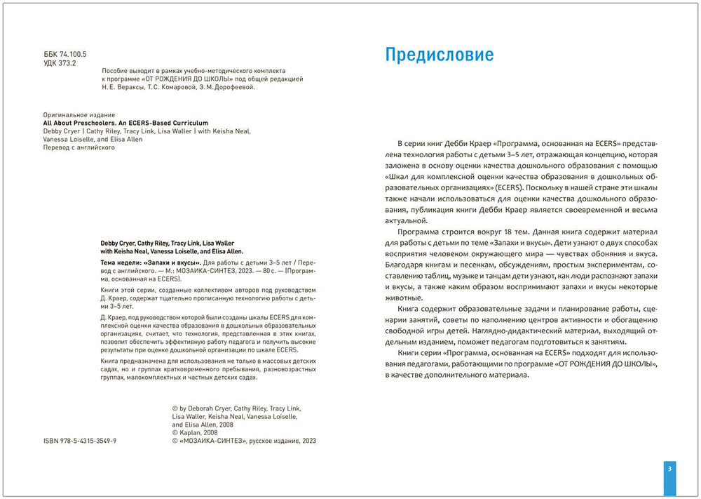 В серии книг Дебби Краер "Программа, основанная на ECERS»"представлена технология работы с детьми 3–5 лет, отражающая концепцию, которая заложена в основу оценки качества дошкольного образования с помощью "Шкал для комплексной оценки качества образования в дошкольных образовательных организациях" (ECERS). Поскольку в нашей стране эти шкалы также начали использоваться для оценки качества дошкольного образования, публикация книги Дебби Краер является своевременной и весьма актуальной.