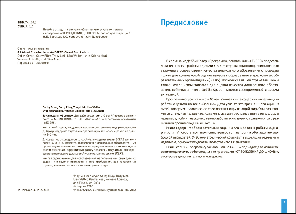Книга входит в серию пособий, созданная коллективом авторов под руководством Д. Краер, и содержит тщательно разработанную технологию работы с детьми 3–5 лет, основанную на многолетнем опыте наблюдения за работой ДОО и оценке их образовательной среды по Шкале для комплексной оценки качества образования в дошкольных образовательных организациях (ECERS).