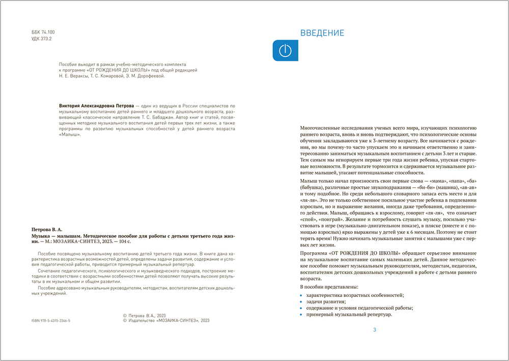 Пособие посвящено музыкальному воспитанию детей третьего года жизни. В книге дана характеристика возрастных возможностей детей, определены задачи развития, содержание и условия педагогической работы, приводится примерный музыкальный репертуар. Сочетание педагогического, психологического и музыковедческого подходов, построение методики в соответствии с возрастными особенностями детей позволяют получать высокие результаты в их музыкальном и общем развитии.