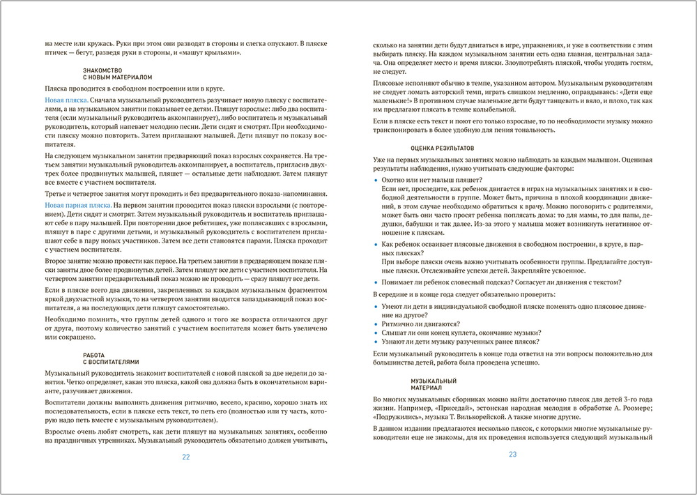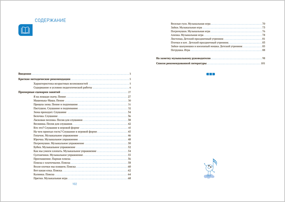 Музыкальный материал включает слушание музыки, песни, музыкально-двигательный показ, пляски и игры. В конце книги есть подраздел "На заметку музыкальному руководителю", в котором рассмотрены часто встречающиеся в работе ошибки.