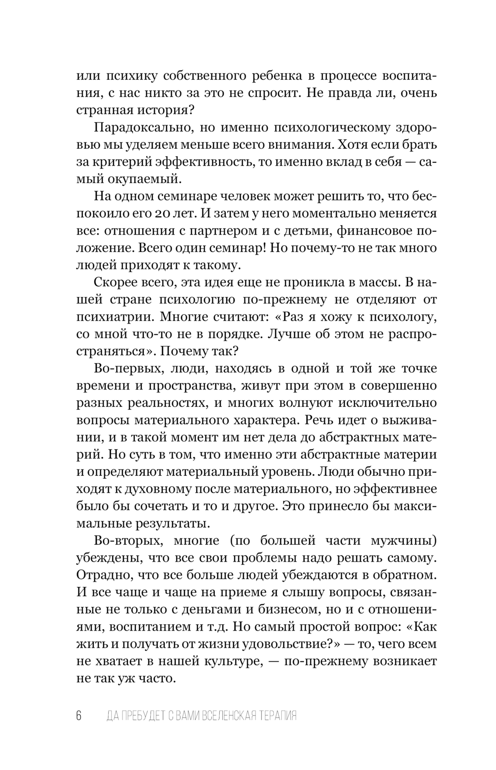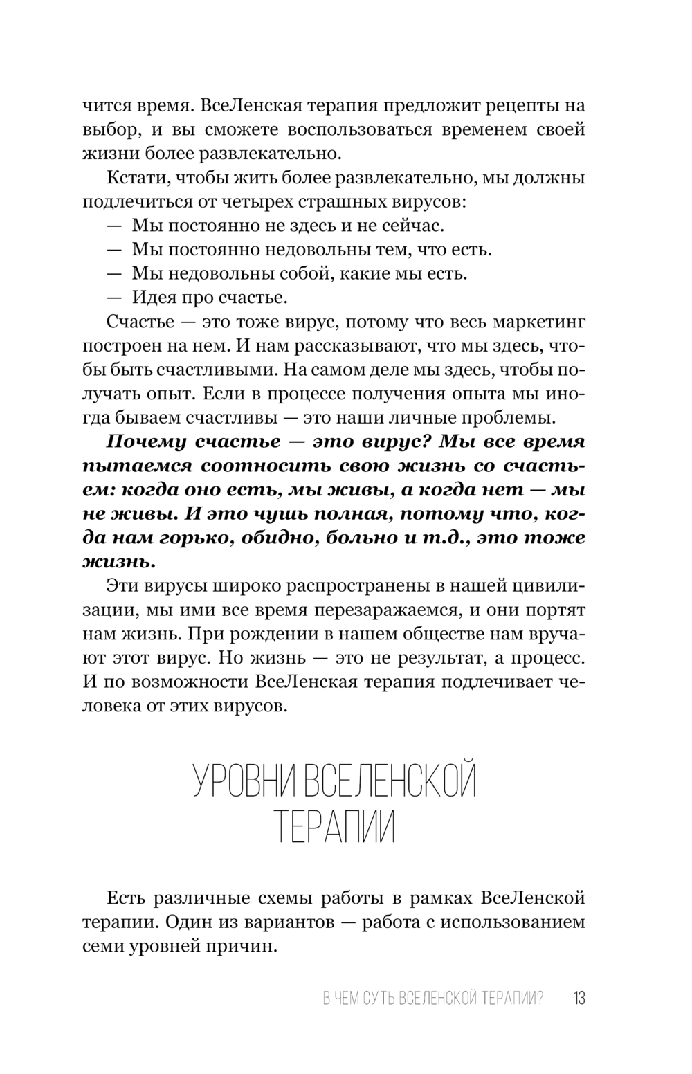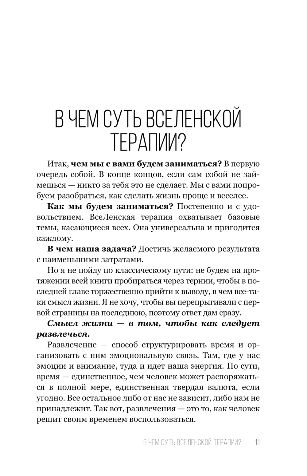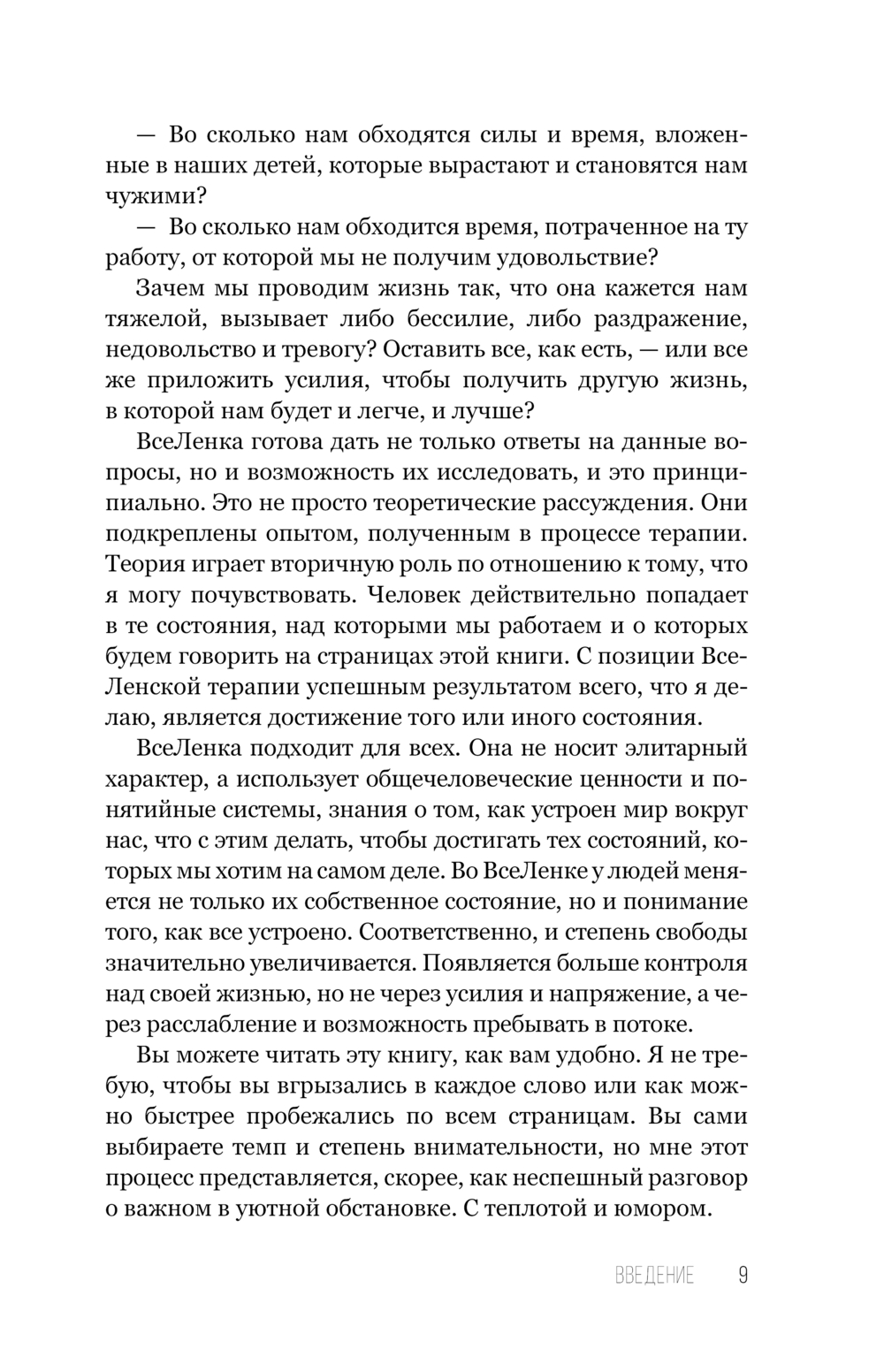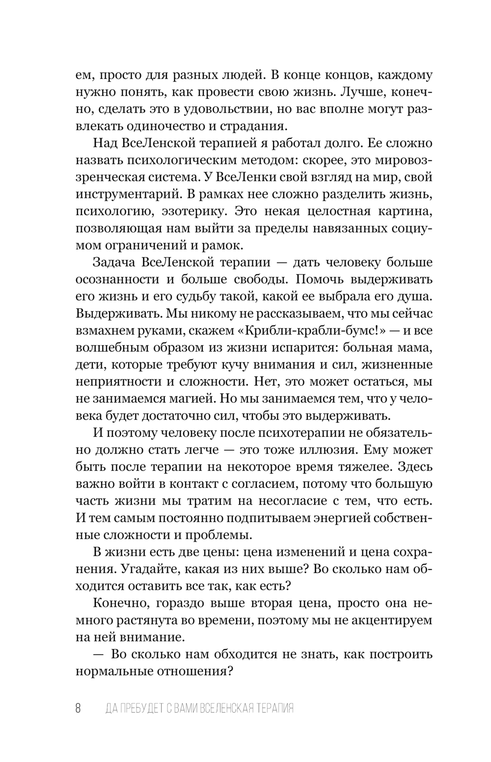 В поисках ответа на вопрос: "Как научиться жить и получать от жизни удовольствие?" автор создал ВсеЛенскую терапию. Ее сложно назвать психологическим методом, скорее это мировоззренческая система, позволяющая относиться к жизни с большей легкостью и юмором. У ВсеЛенки свой собственный инструментарий, свой взгляд на мир, помогающий выйти за пределы навязанных социумом моделей, ограничений и рамок.