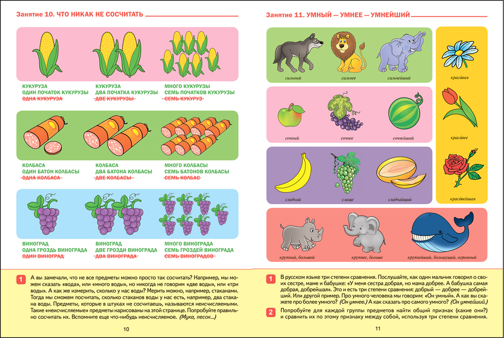 Выполняя задания, предложенные в тетради, дети учатся находить обобщающие слова, группировать знакомые предметы, находить среди них лишние и классифицировать их, правильно употреблять существительные в родительном падеже множественного числа, овладевая словарным составом слова. Дети знакомятся с многозначными словами, закрепляют способы образования существительных с суффиксами, придающие словам различные оттенки (уменьшительно-ласкательный, увеличения, уменьшения), учатся способу образования глаголов с приставками, подбирать антонимы к ним и прилагательным, составлять рассказы по картинкам, выстраивать логическую цепочку, определяя, что происходило раньше, что потом.