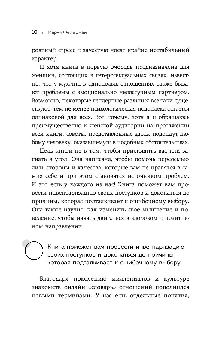 Опираясь на годы практической работы, доктор Фейерман поможет провести инвентаризацию своих поступков и докопаться до причины, которая подталкивает вас к ошибочному выбору. Упражнения и реальные истории пациентов помогут обрести контроль над своей жизнью и научиться строить здоровые, счастливые отношения, которые дарят любовь, поддержку и глубокую эмоциональную связь.