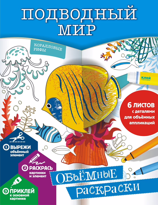 Книга "Подводный мир" новой серии "Объемные раскраски" содержит 6 листов с деталями для объемных аппликаций.