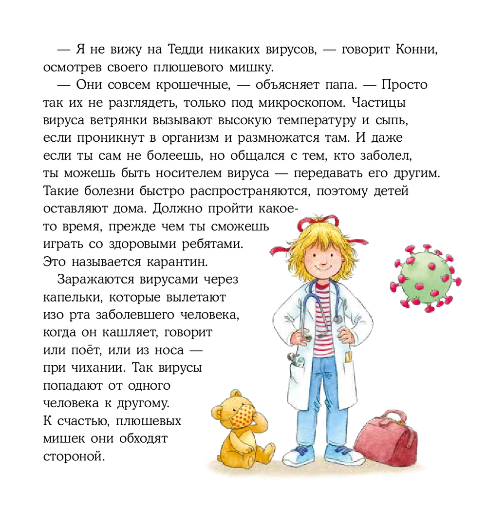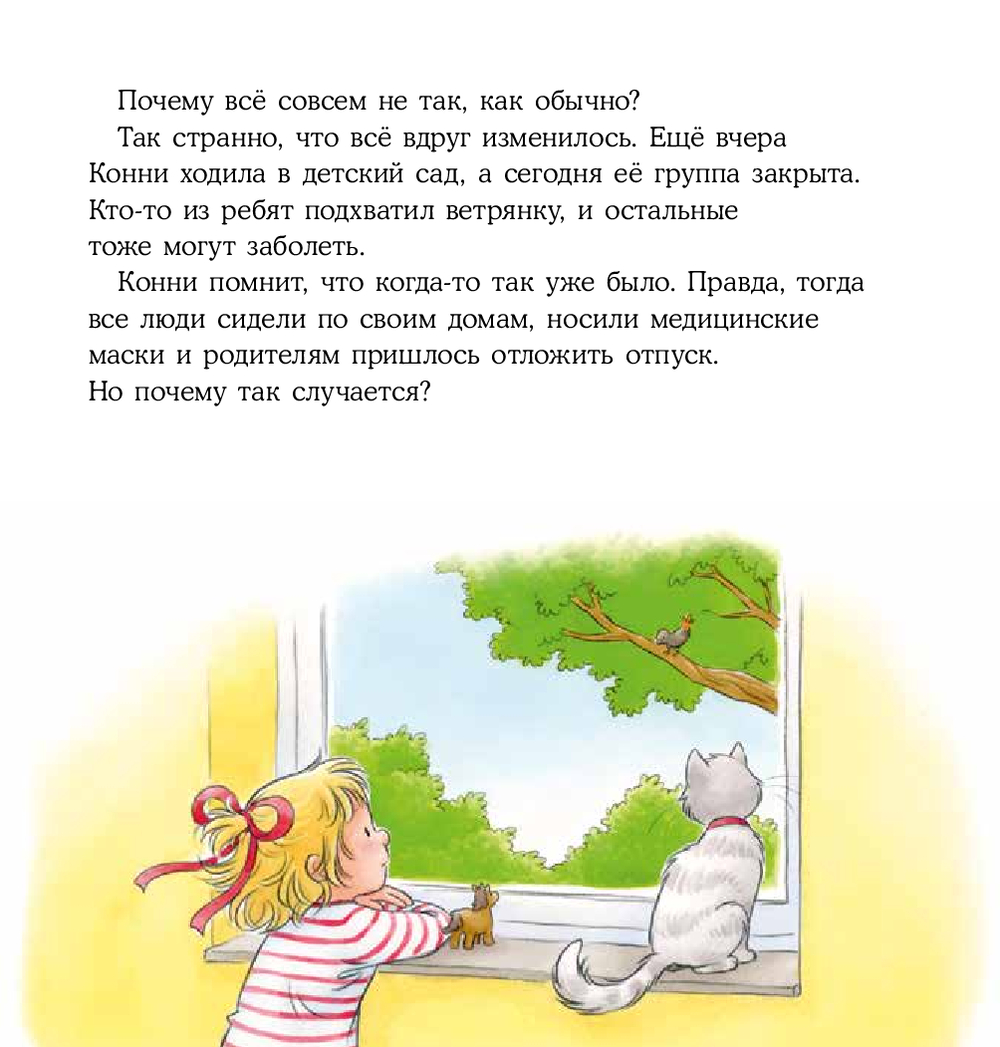 Конни сейчас на карантине. Она не может ходить в детский сад, как обычно. Конни, как и ты, давно не видела друзей и бабушку с дедушкой и очень по ним соскучилась. Но она не унывает! Ведь заболеть никому не хочется, а правила, которые надо соблюдать, чтобы не заразиться, довольно просты.