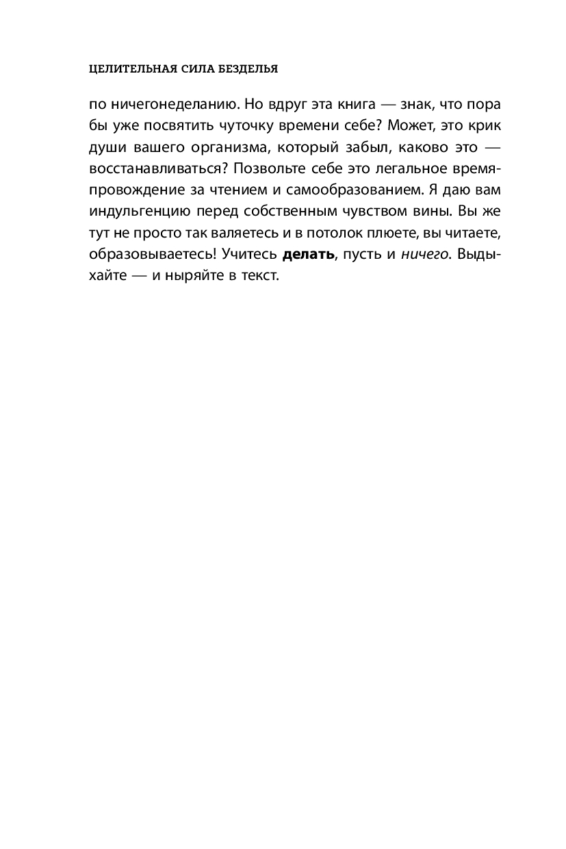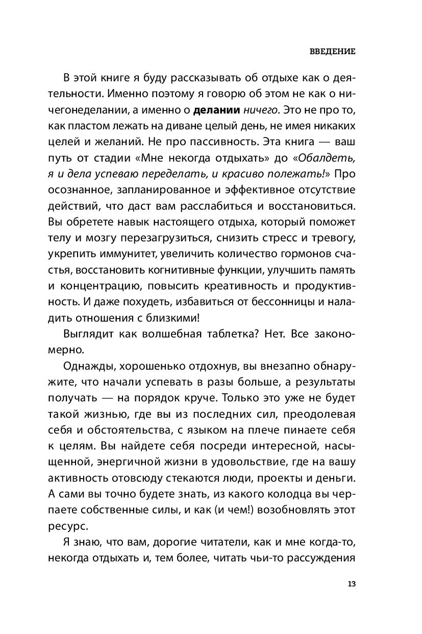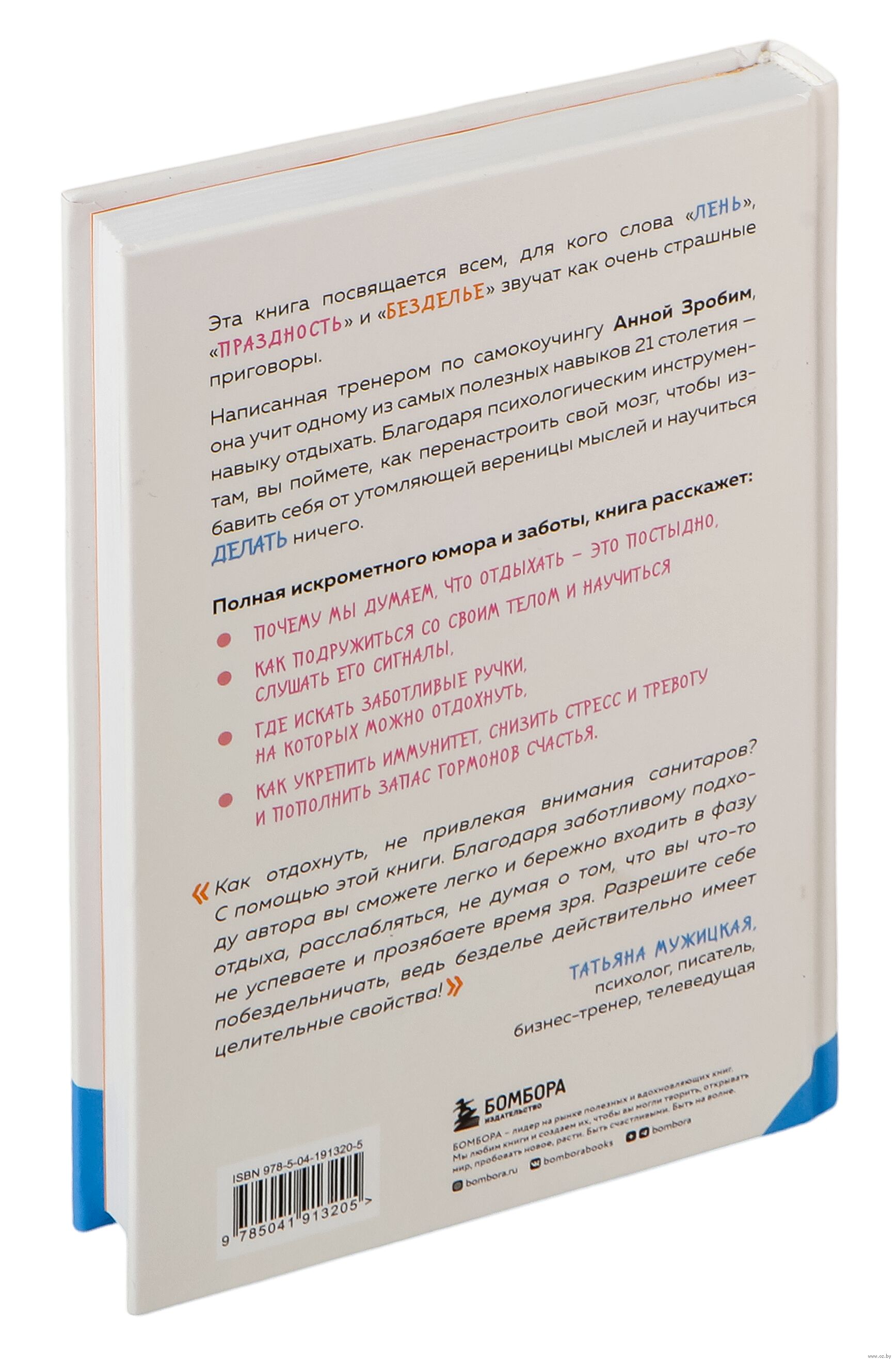 В книге она рассказывает о навыке ДЕЛАТЬ ничего – способе полезного бездействия, благодаря которому можно быстро снизить уровень тревоги, улучшить память и концентрацию, перезагрузить мозг и избавиться от бессонницы. А еще книга учит давать себе индульгенцию на отдых, который вам хочется.