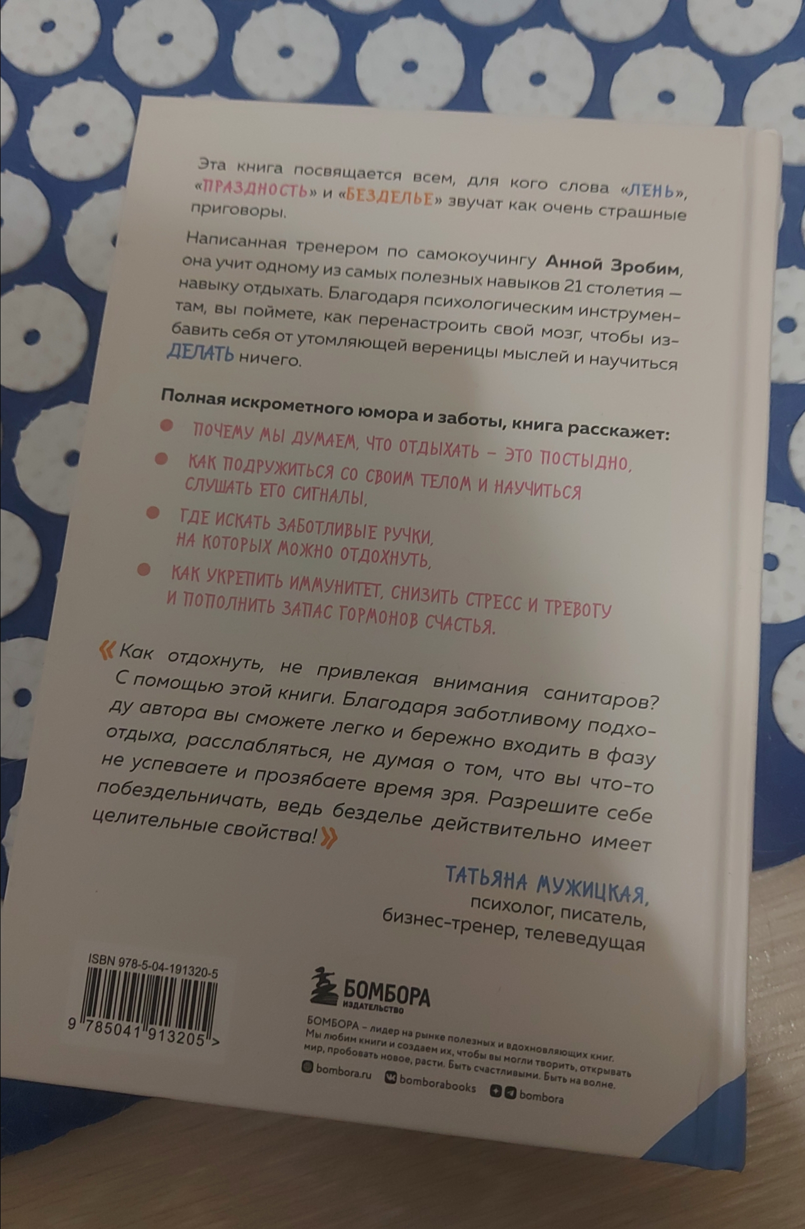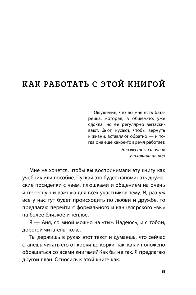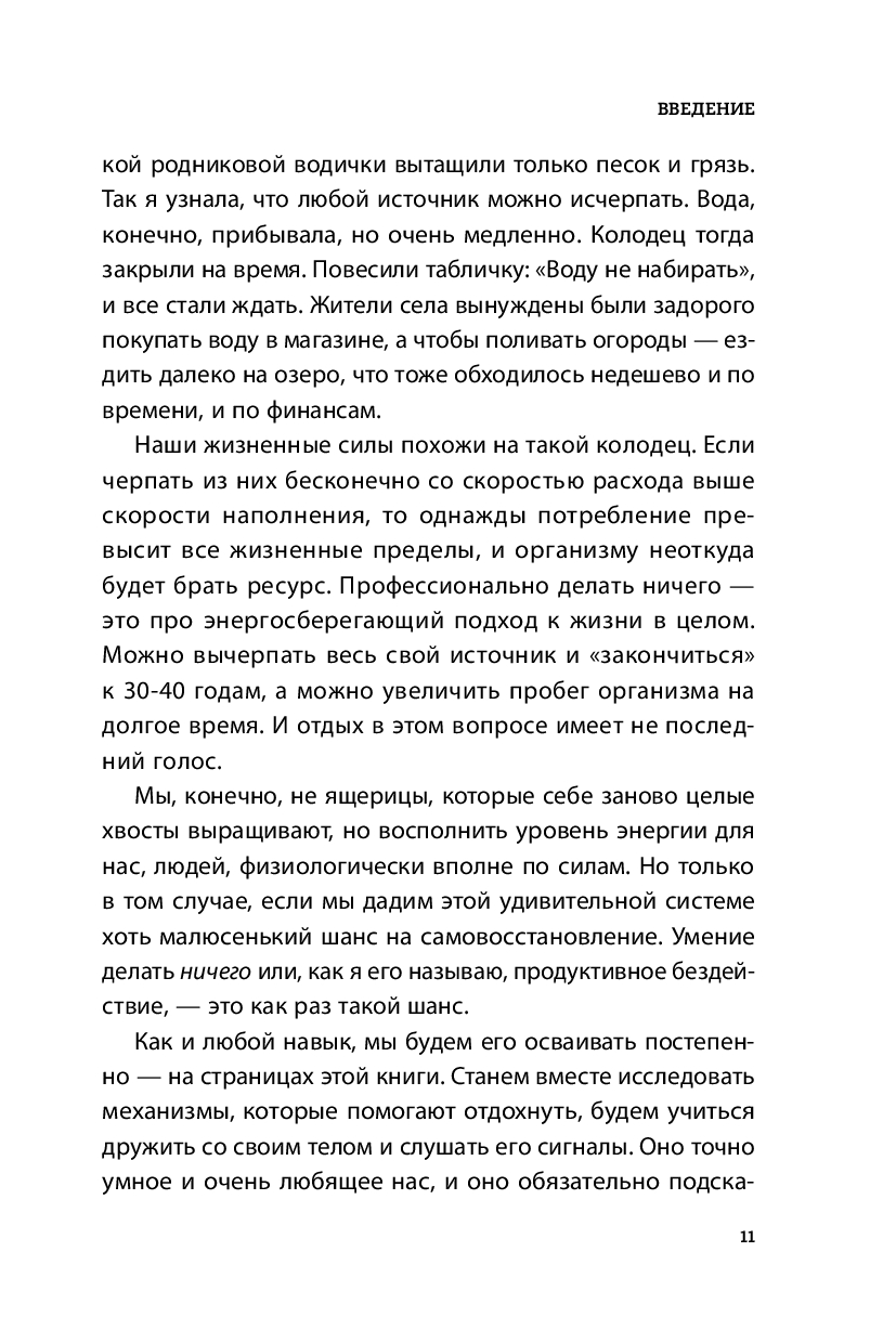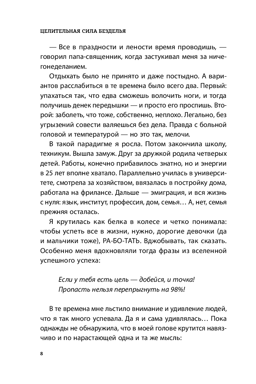 В книге она рассказывает о навыке ДЕЛАТЬ ничего – способе полезного бездействия, благодаря которому можно быстро снизить уровень тревоги, улучшить память и концентрацию, перезагрузить мозг и избавиться от бессонницы. А еще книга учит давать себе индульгенцию на отдых, который вам хочется.
