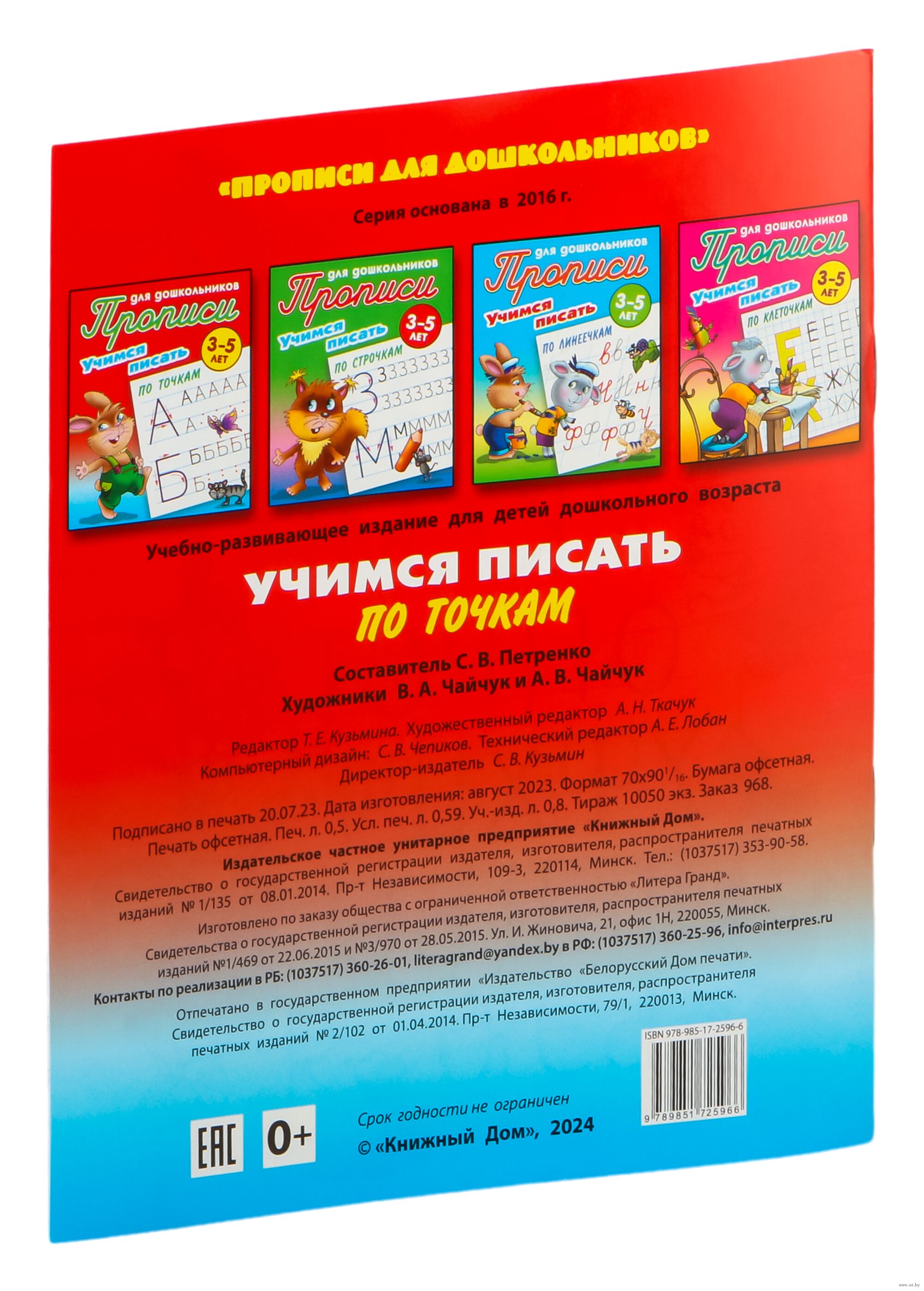 Эти прописи помогут ребёнку в игровой форме развить зрительное восприятие, внимание, мелкую моторику и координацию движения руки. Чтобы малыш не уставал прописи не перегружены упражнениями, графические элементы даны в увеличенном виде, а на разворотах расположены забавные рисунки, связанные с выполняемыми заданиями. Красные стрелки на буквах и точки указывают начало действия при их написании. Сначала пишем по обозначенному контуру, а затем закрепляем навыки написания в свободной линейке по точкам. Занимайтесь с ребёнком не более 20-25 минут. Обязательно оцените старания маленького ученика и похвалите его за усердие.