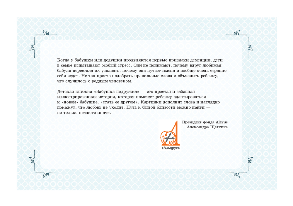 Когда семья сталкивается с деменцией, многое приходится менять и переосмысливать. Близкий человек утрачивает самостоятельность, его поведение и характер становятся другими. Это сложно принять, и особенно трудно бывает детям: они не понимают, что случилось с их любимыми бабушками и дедушками. Именно для детей и написана эта трогательная история про бабушку и внучку, которые с развитием деменции у бабушки превращаются в лучших подружек. Лаконичный текст и яркие иллюстрации помогут младшим членам семьи разобраться, что испытывают пожилые родственники, и подскажут, как не утратить с ними контакт.