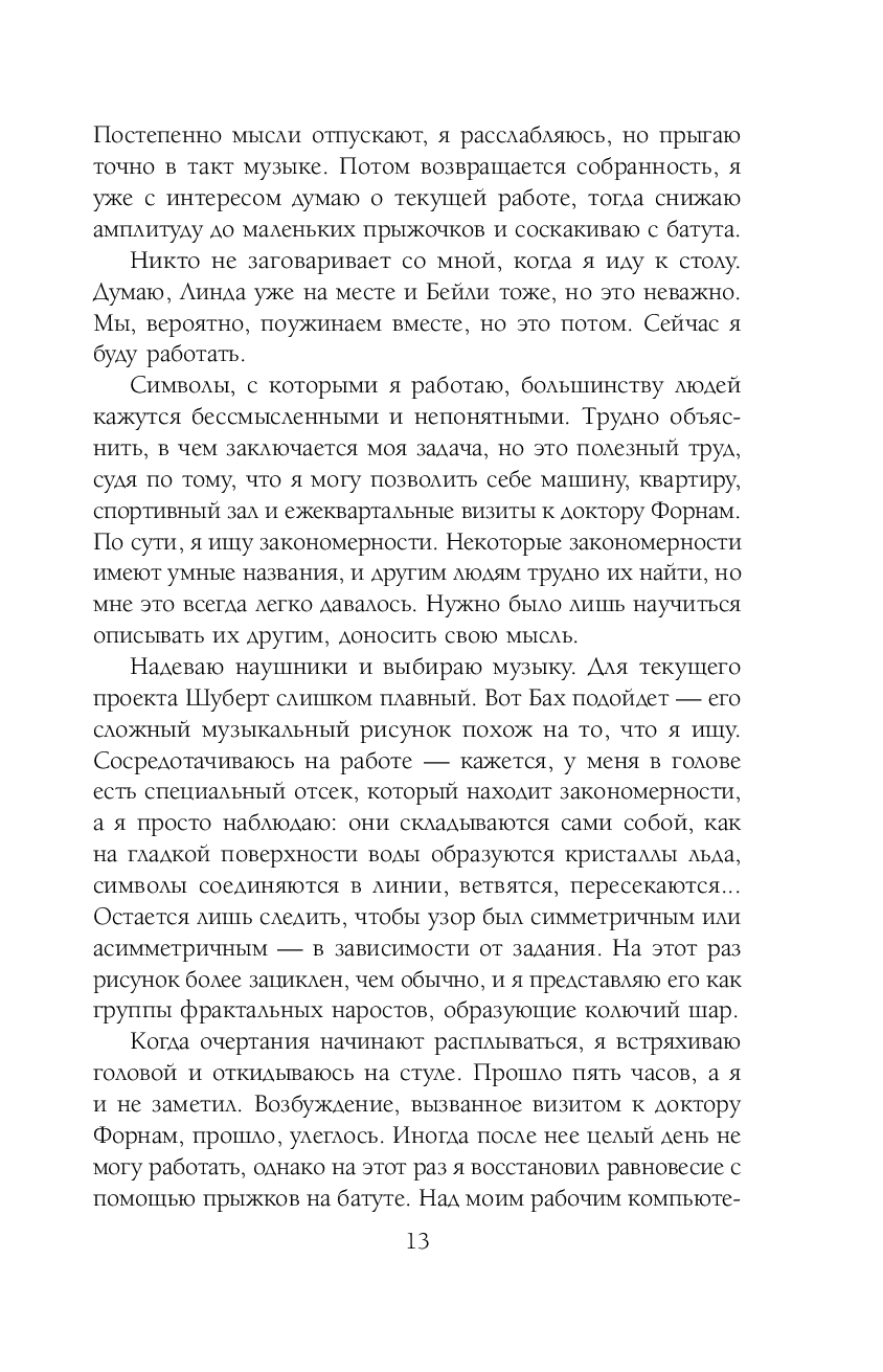 Лу Аррендейл – представитель этого потерянного поколения. Он ведет спокойную и независимую жизнь, не считая ежегодных визитов к психологу, имеет стабильную работу в фармацевтической компании, научился смотреть собеседнику в глаза, умеет учитывать вежливые условности в разговорах и делает все возможное, чтобы быть как можно более нормальным и не привлекать к себе внимания. Но теперь его спокойная жизнь оказывается под угрозой. Появляется новое экспериментальное лечение, позволяющее излечить взрослого человека от заболеваний аутистического спектра. После него Лу станет таким же, как и все вокруг. Но Лу задается вопросами – если он избавится от аутизма, останется ли самим собой? Будет ли по-прежнему любить классическую музыку? Видеть в мире те же цвета и узоры, оттенки и тона, недоступные другим? И, самое главное, будет ли он так же любить Марджори, девушку, которая, вероятно, никогда не ответит ему взаимностью, пока он болен?