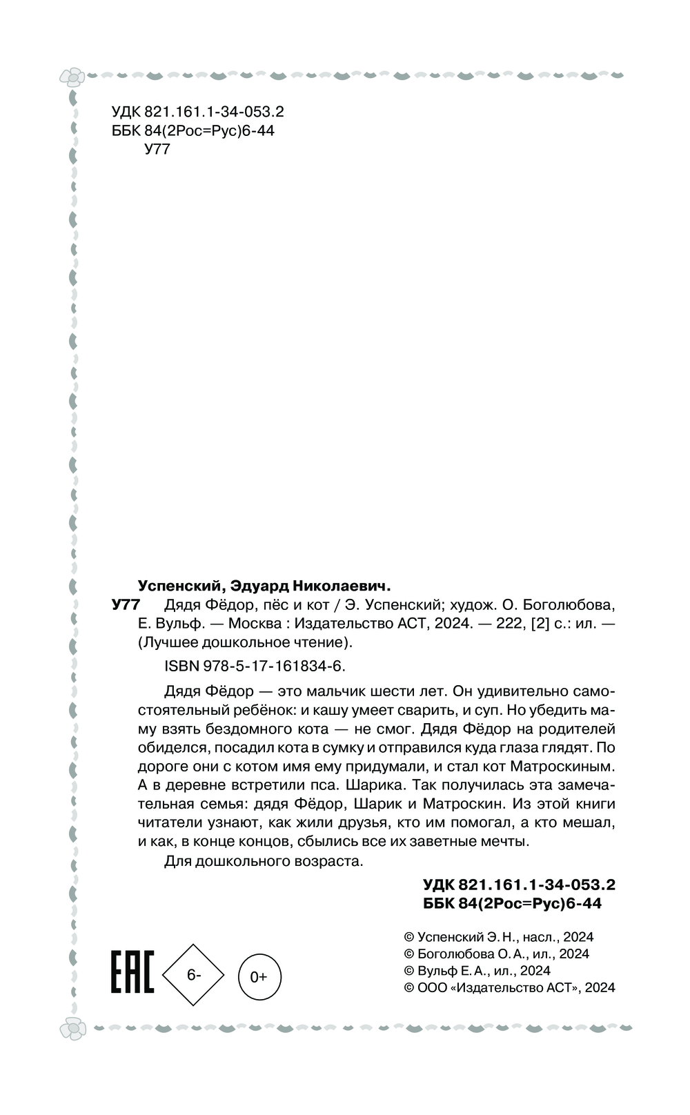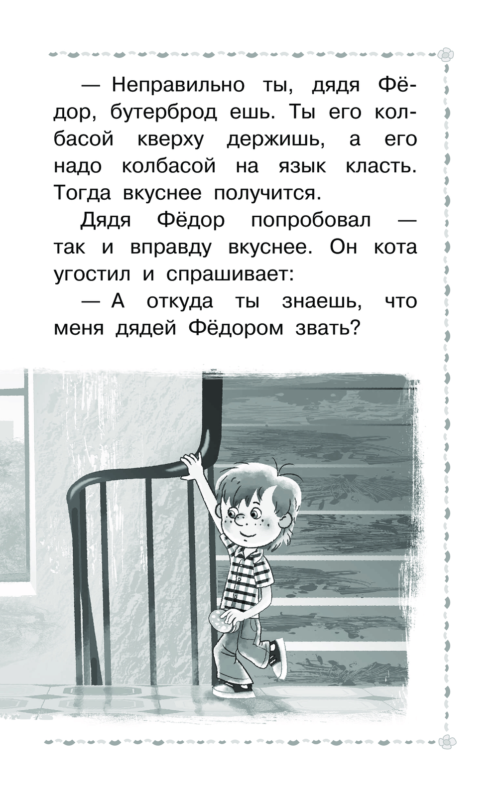 Дядя Фёдор – это мальчик шести лет. Он удивительно самостоятельный ребёнок: и кашу умеет сварить, и суп. Но убедить маму взять бездомного кота – не смог. Дядя Фёдор на родителей обиделся, посадил кота в сумку и отправился куда глаза глядят. По дороге они с котом имя ему придумали, и стал кот Матроскиным.