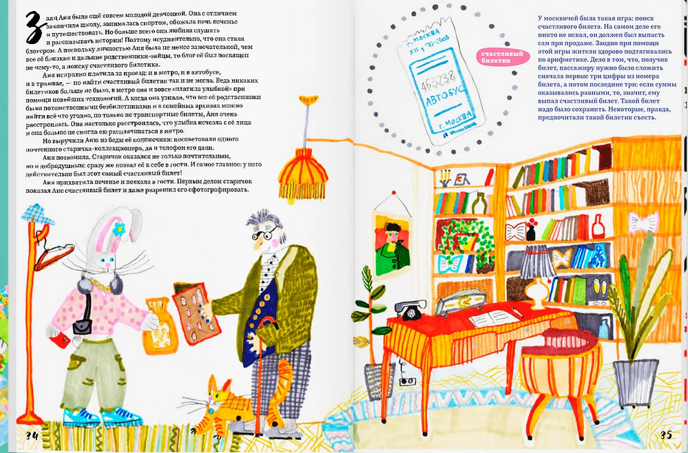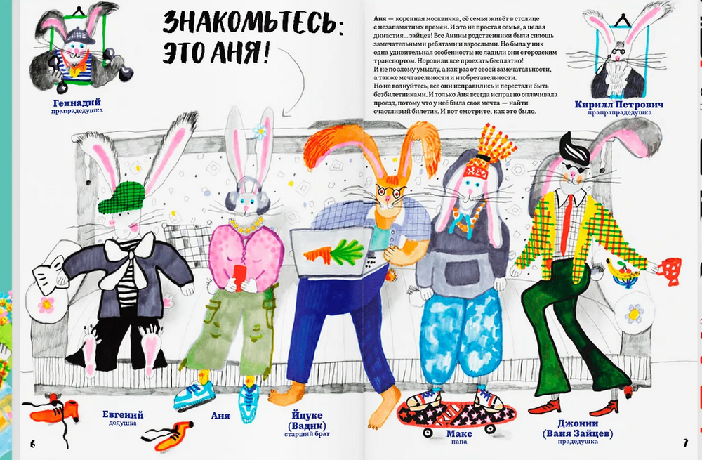 Книга-картинка с остроумными и нежными рассказами Дениса Крюкова и такими же иллюстрациями Полины Калашниковой знакомит детей не только с ушастыми горожанами, но и с историей развития городского транспорта и билетной системы c конца XIX века до наших дней.
