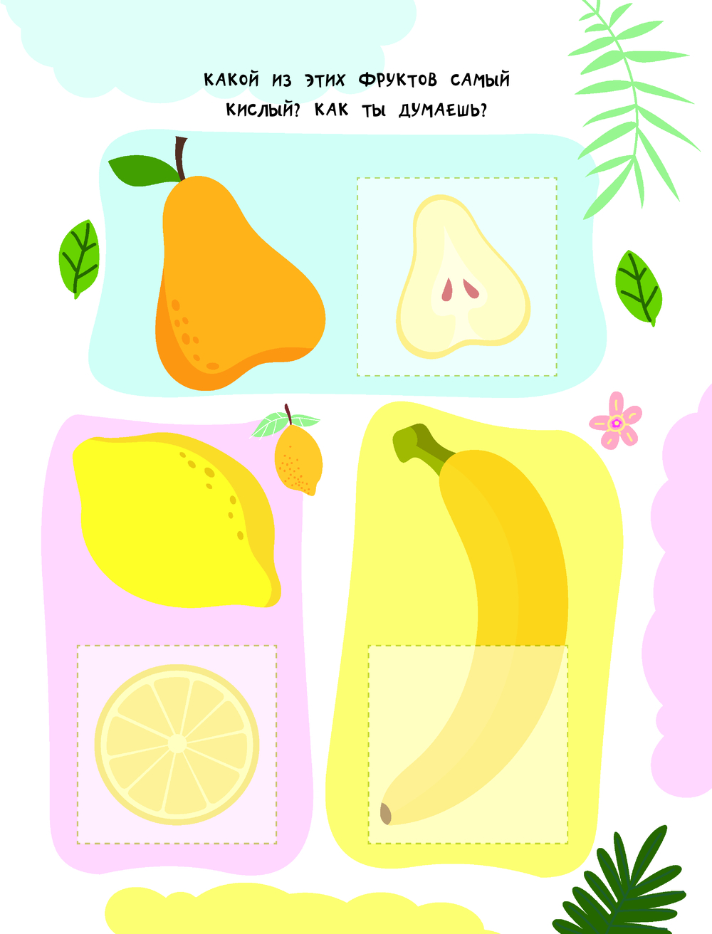 "Фрукты и овощи" – это замечательная книга с яркими многоразовыми наклейками. Малыш подбирает к каждой картинке подходящую наклейку-половинку, а затем аккуратно наклеивает её. На первый взгляд кажется, что это легко. Но на самом деле ребёнок должен приложить очень много усилий! Если с первого раза не получится наклеить ровно – не беда! Ведь наклейку можно отклеить и легко повторить попытку снова. Занимаясь по книге, малыш узнает, какие бывают фрукты и овощи – яблоки, бананы, капуста, картофель и так далее. А ещё юный ученик тренирует мелкую моторику и координацию движений – важные навыки для письма.