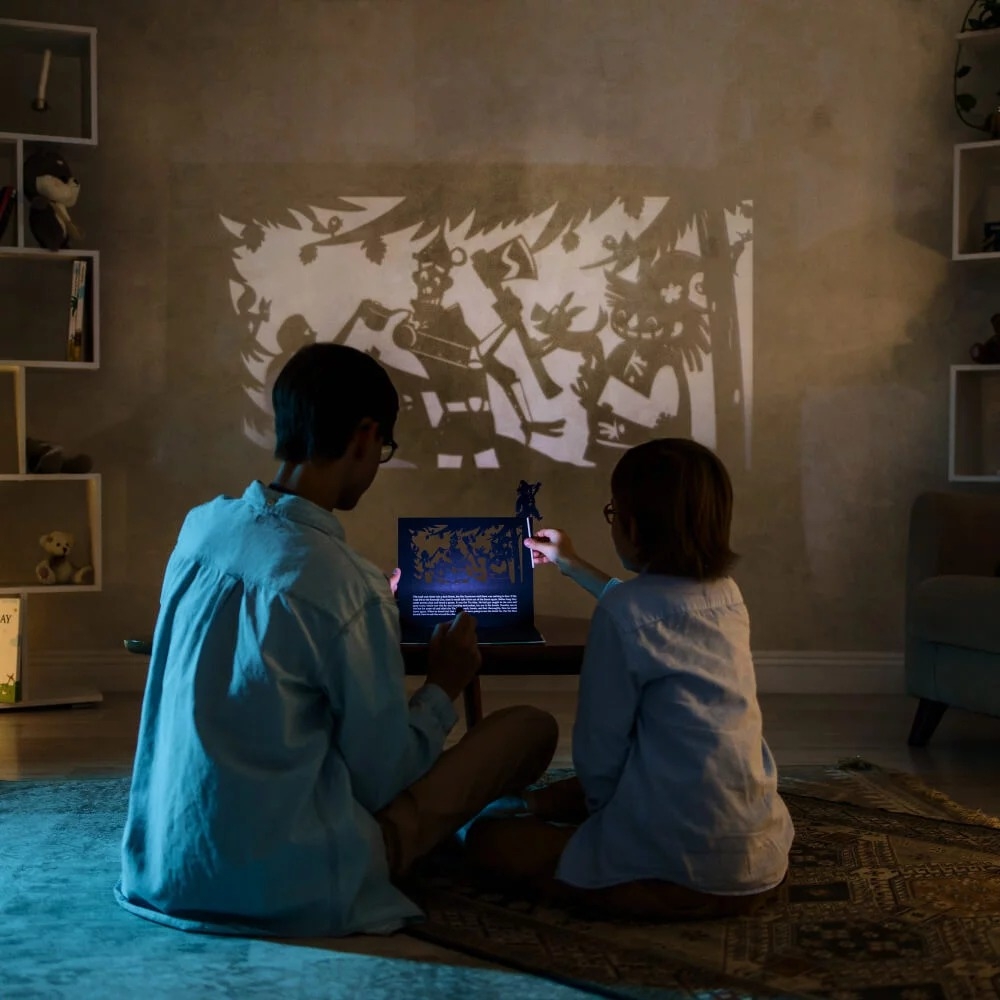 Подарочный набор прекрасно подходит для первой покупки и подарка. Уникальная, запатентованная конструкция, которая при открытии книги приводит страницы в вертикальное положение – идеально для теневого представления. Поставьте книгу на стол, на кровать или даже на колени – ей удобно пользоваться в в любом положении!