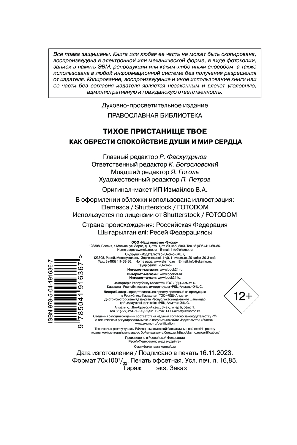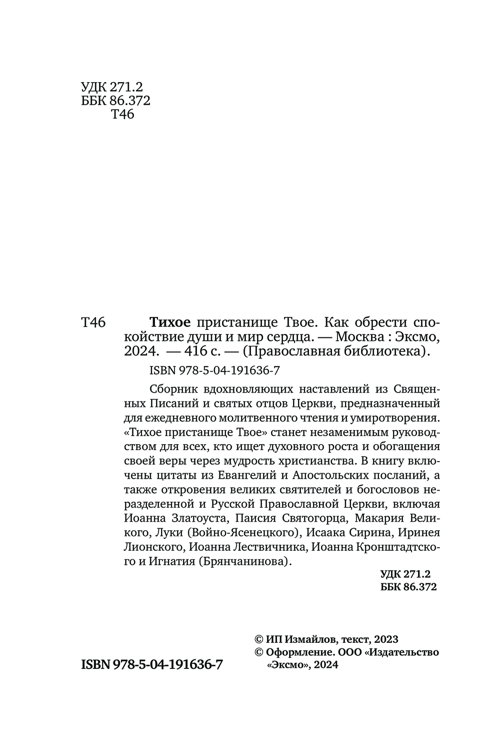 "Тихое пристанище Твое. Как обрести спокойствие души и мир сердца" – сборник вдохновляющих наставлений из Священных Писаний, Евангелий и Апостольских посланий. Найдите свое тихое пристанище и обретите душевное спокойствие в мудрости великих святителей и богословов неразделенной Русской Православной Церкви: Иоанн Златоуст, Макарий Великий, Исаак Сирин, Ириней Лионский, Иоанн Лествичник и Серафим Слободской.